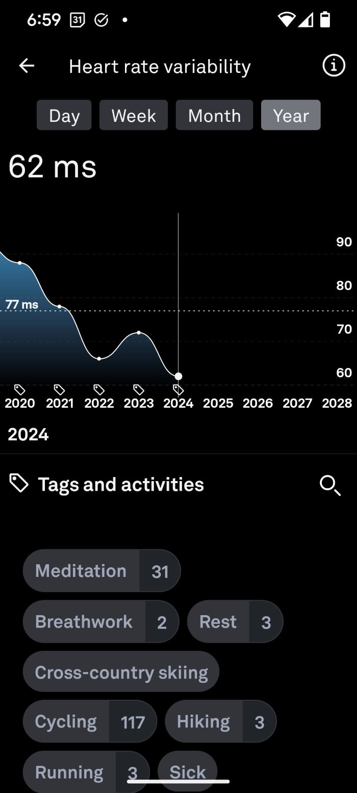 Now, at the distinguished age of 68, with my cycling jersey snug and an eagle eye on my diet (yes, I've broken up with "nasty" oils and struggling with the sweet talk of sugar - er, beer), the connection between my HRV and my not-so-slowly expanding waistline is undeniable. The plot thickens, especially when you consider the journey from a sprightly 77ms in 2020 to a more reflective 62ms in 2024, despite my valiant efforts.