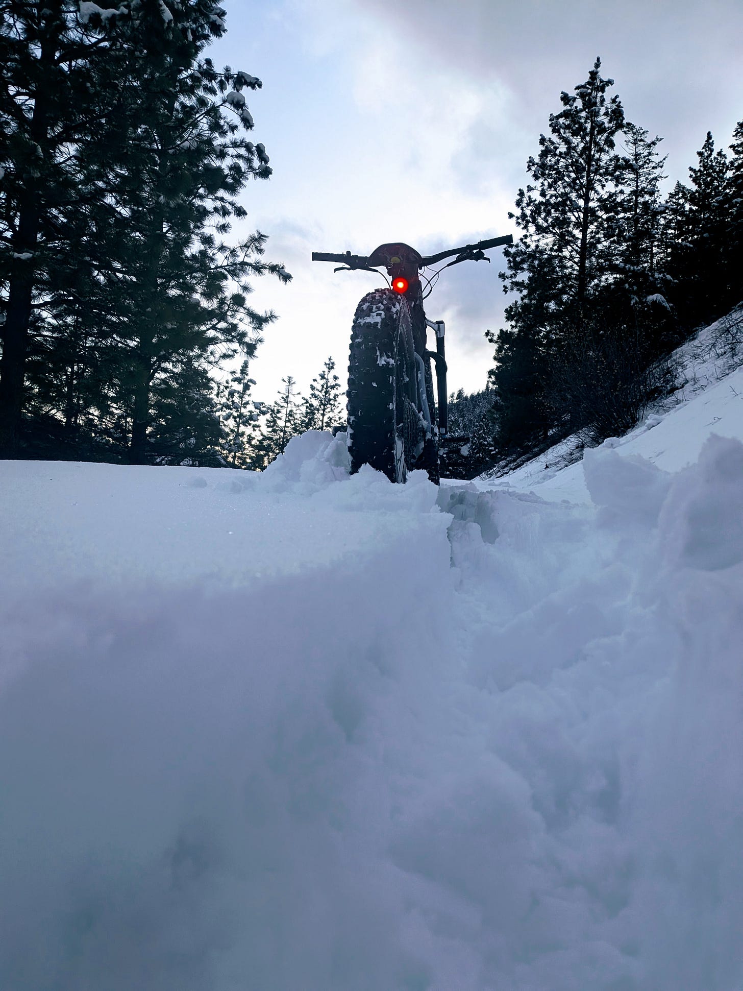 Then the universe remembered who I am and adjusted the difficulty setting. The snow got deeper until downhill stopped being downhill, because it was up to my axles and the bike just… sat there. So I made the kind of decision you only make at night: cut toward Zephyr and gamble on a power line I had never ridden, half expecting a secret shortcut, half expecting a swamp with feelings. Twenty feet in, it turned into something between a tree well and a prank. The bike would not turn around, my legs were working overtime, and I spent about an hour wrestling in silence like a guy arguing with a mattress in public.