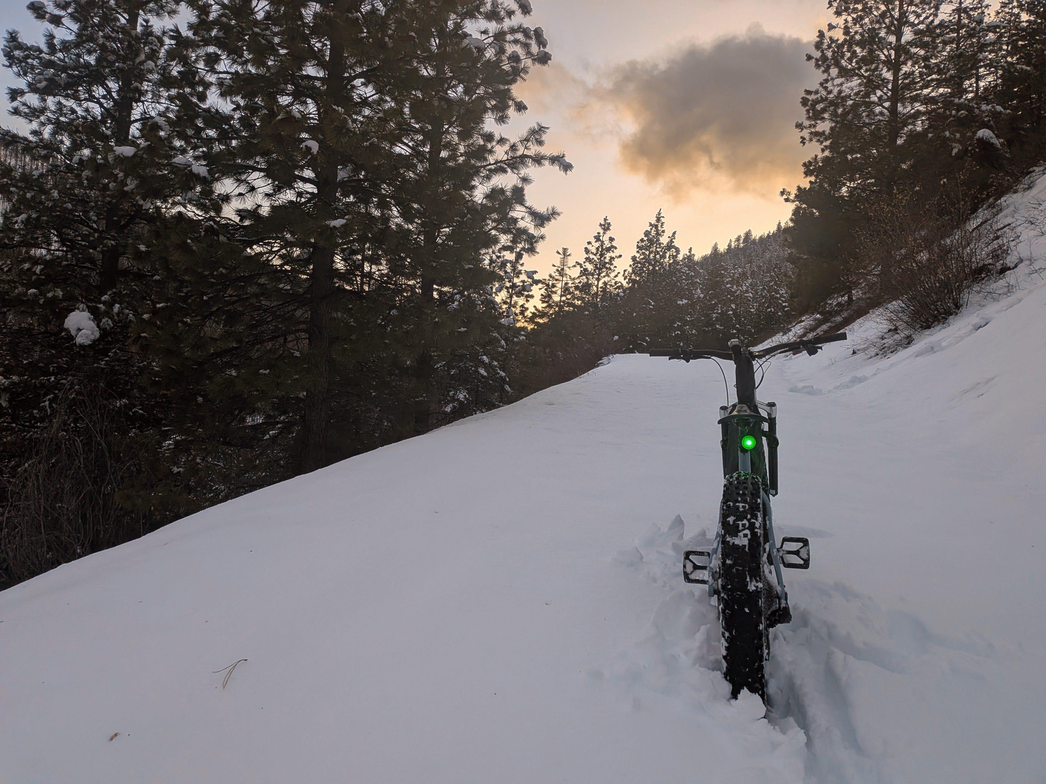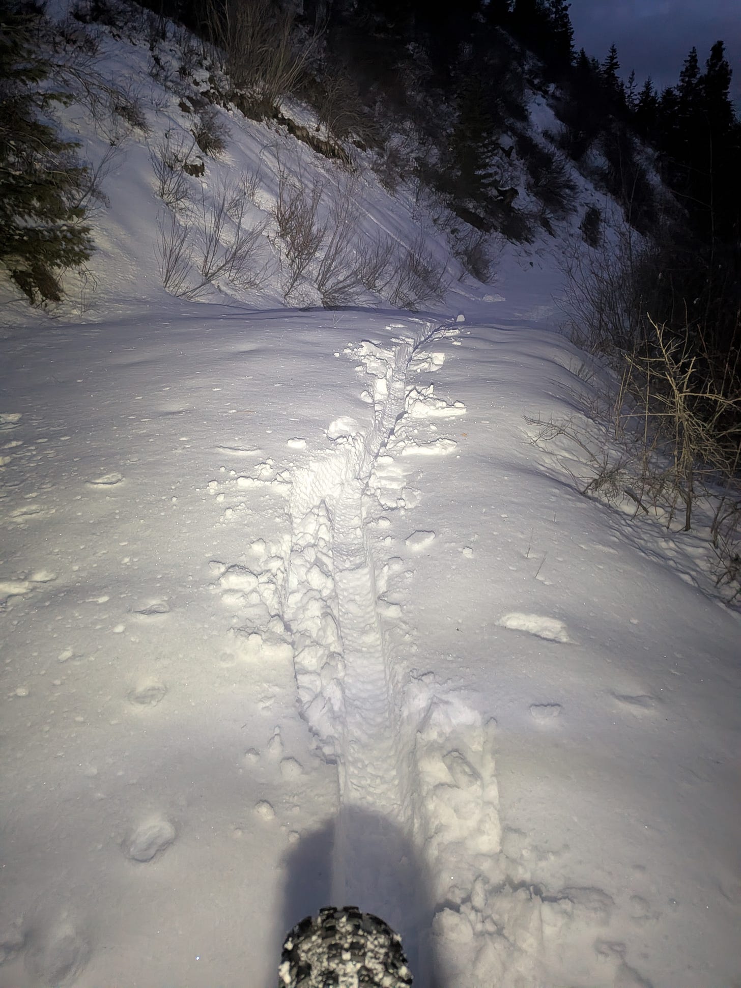 Last night started like one of those rides where you think you accidentally chose the right life. Patty Canyon looked perfect from the parking lot, fresh snow with that soft, sticky grip that makes a fat bike feel like it has claws. I rolled out a little late, sky fading out, and the trail was doing that polite thing where it pretends it will behave. The snow even firmed up as it got dark, which felt like nature rewarding my questionable time management. I pushed toward Deer Creek, feeling oddly confident, like I was about to get a personal applause break from the universe.
