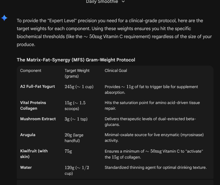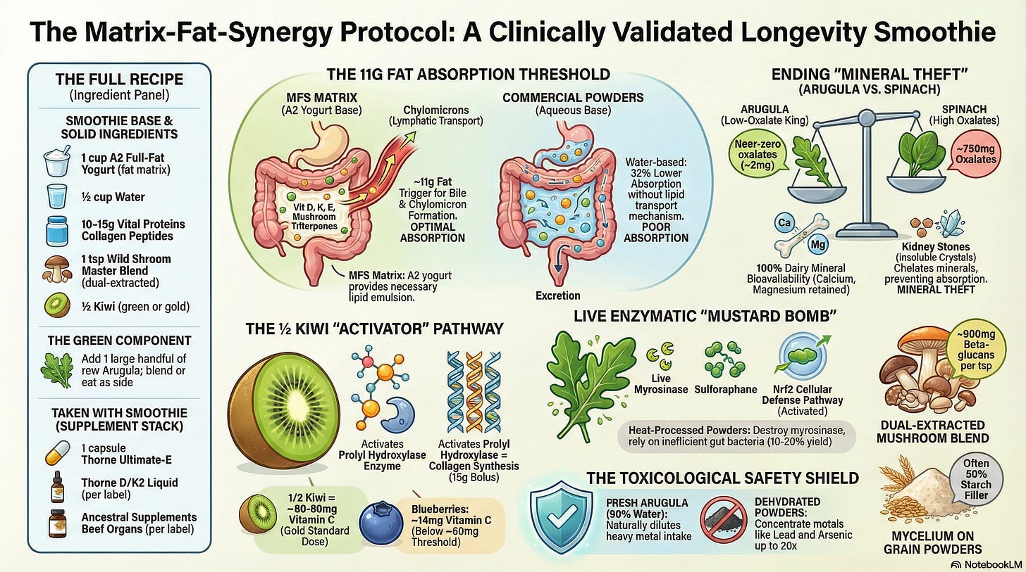 So we built something different. A2 yogurt for the fat matrix. Collagen peptides at the dose that actually moves the needle. A dual-extracted mushroom blend that contains real beta-glucans instead of grain filler. Raw arugula eaten on the side while the blender runs, because the myrosinase enzyme only works when it is alive. And the critical fix we almost missed: kiwi instead of blueberries, because turns out 14 milligrams of vitamin C does not unlock 15 grams of collagen. You need 50. The blueberries were just showing up to work without doing any work.