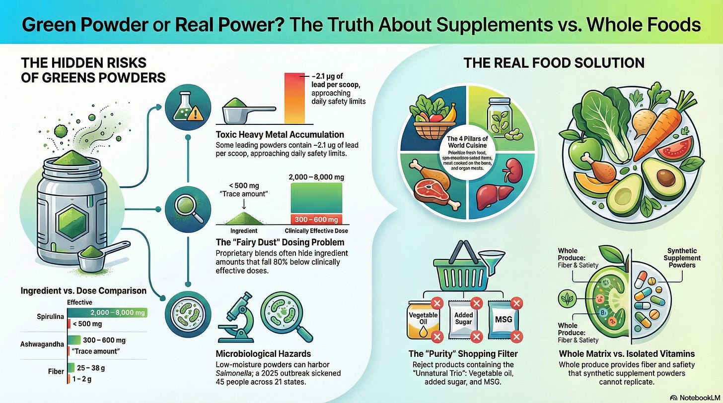 The thing is, when you eat meat, eggs, and starch like I do, you cannot just grab any smoothie recipe off the internet and call it longevity. The commercial greens powders promise the world in a scoop, but the deeper we dug, the more the whole industry started looking like a mirage. Proprietary blends hiding poverty-level doses. Spinach bases stealing your minerals through oxalate chemistry. Heat-processed mushroom powders that are mostly rice starch dressed up in adaptogenic clothing.