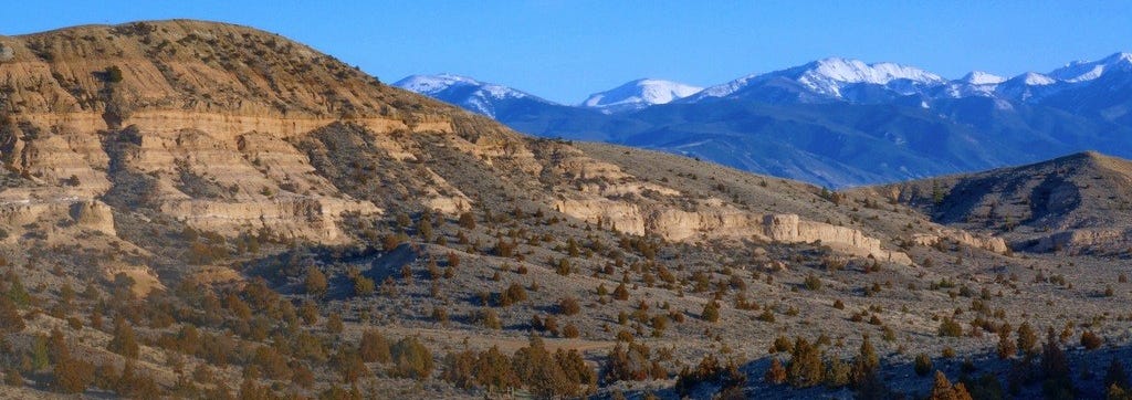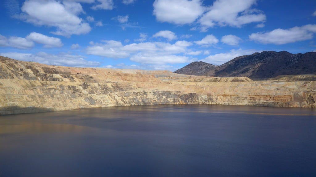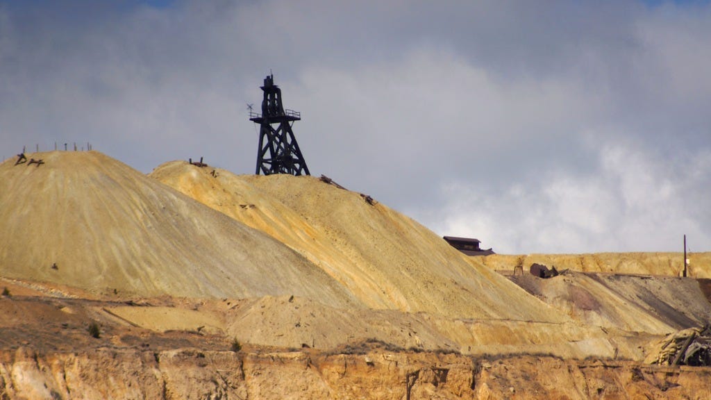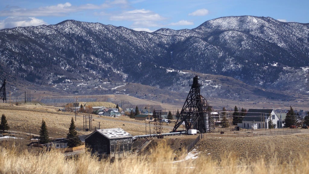 The images in this gallery showcase the rugged, industrial beauty of a mining area and quarry site referred to as Butte Montana. The first image presents a striking contrast between the snow-capped, craggy mountain peaks and the dense forest below, creating a dramatic and atmospheric landscape.