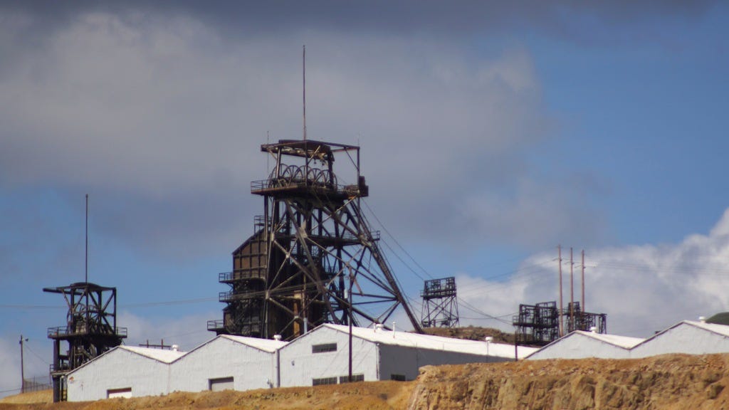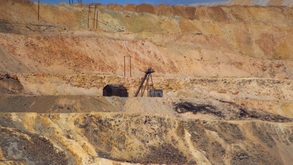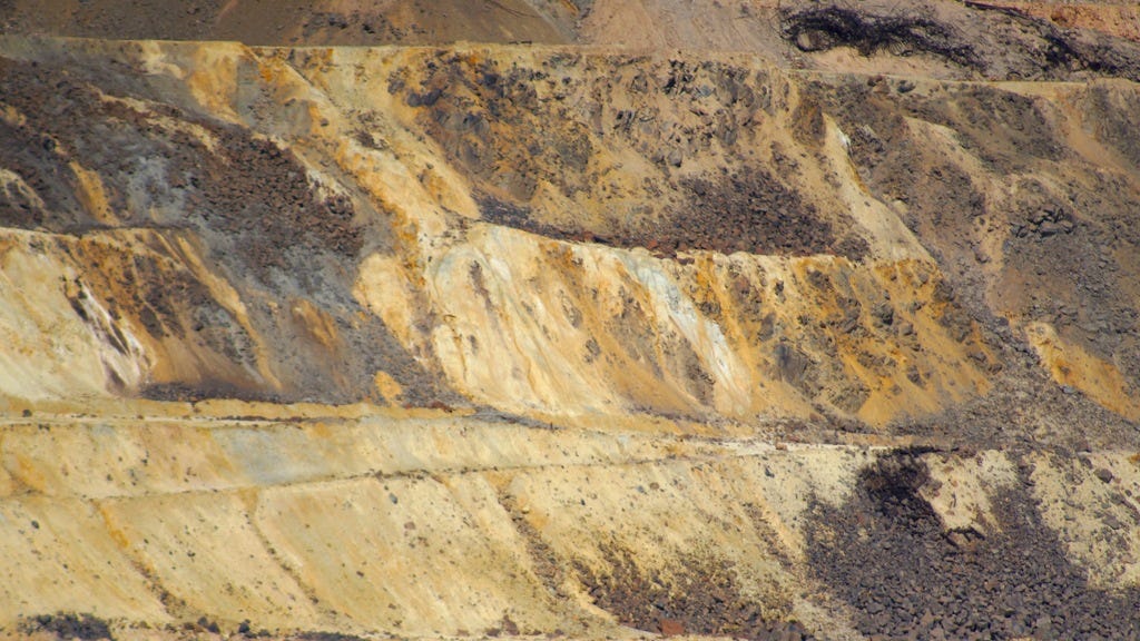 The remaining images depict the raw, earthy tones and textures of the mining site itself. Massive piles of excavated earth and rock formations dominate the scenes, with heavy machinery and structures like headframes and mining towers dotting the landscape. These industrial elements stand in contrast to the natural surroundings, yet they possess an austere beauty in their own right.