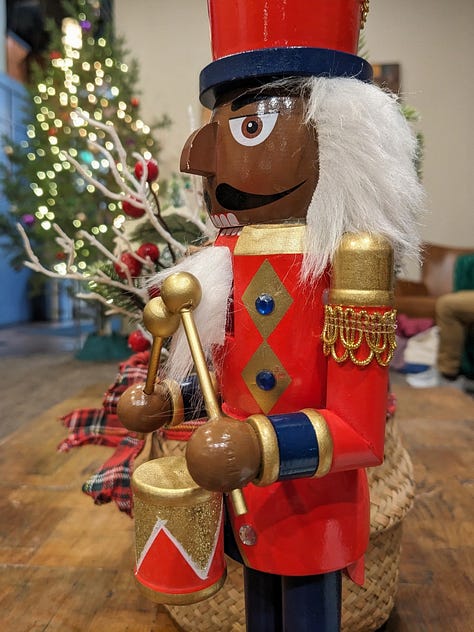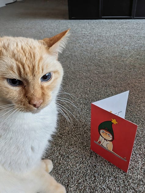 Then came the Gift Giving Gauntlet. The fantasy snapped the second I realized the perfect gift for snuggles was not a Shark robot vacuum. The nutcracker judged me from the table. Blue judged me harder, staring at a Christmas card like he had clearly asked for premium tuna, not a flat version of himself. Every suggestion required effort and love. I felt like the Grinch with better WiFi, scrolling, sighing, wondering if I could just gift everyone a Shared Prompt and call it a day.