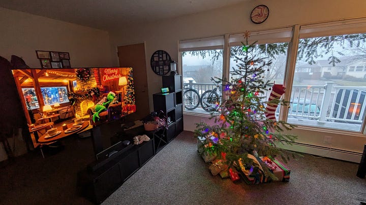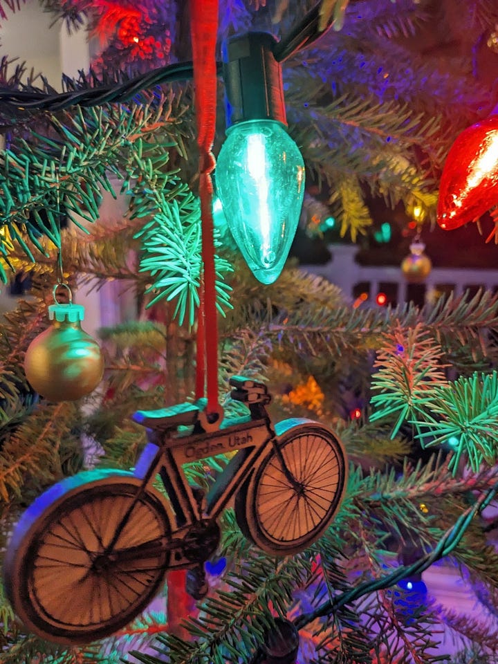 I traded the bike everything mindset for the Holiday Fantasy Protocol and, for a minute, it worked. Mr. Bear got a formal bow tie. The living room slipped into a Studio Ghibli fever dream. The tree quietly flexed with a wooden bike ornament from Ogden, Utah, a reminder that even under glitter I still want dirt under my tires. We sat in the glow of a 4K fireplace, convinced we had cracked the code on being normal holiday people.