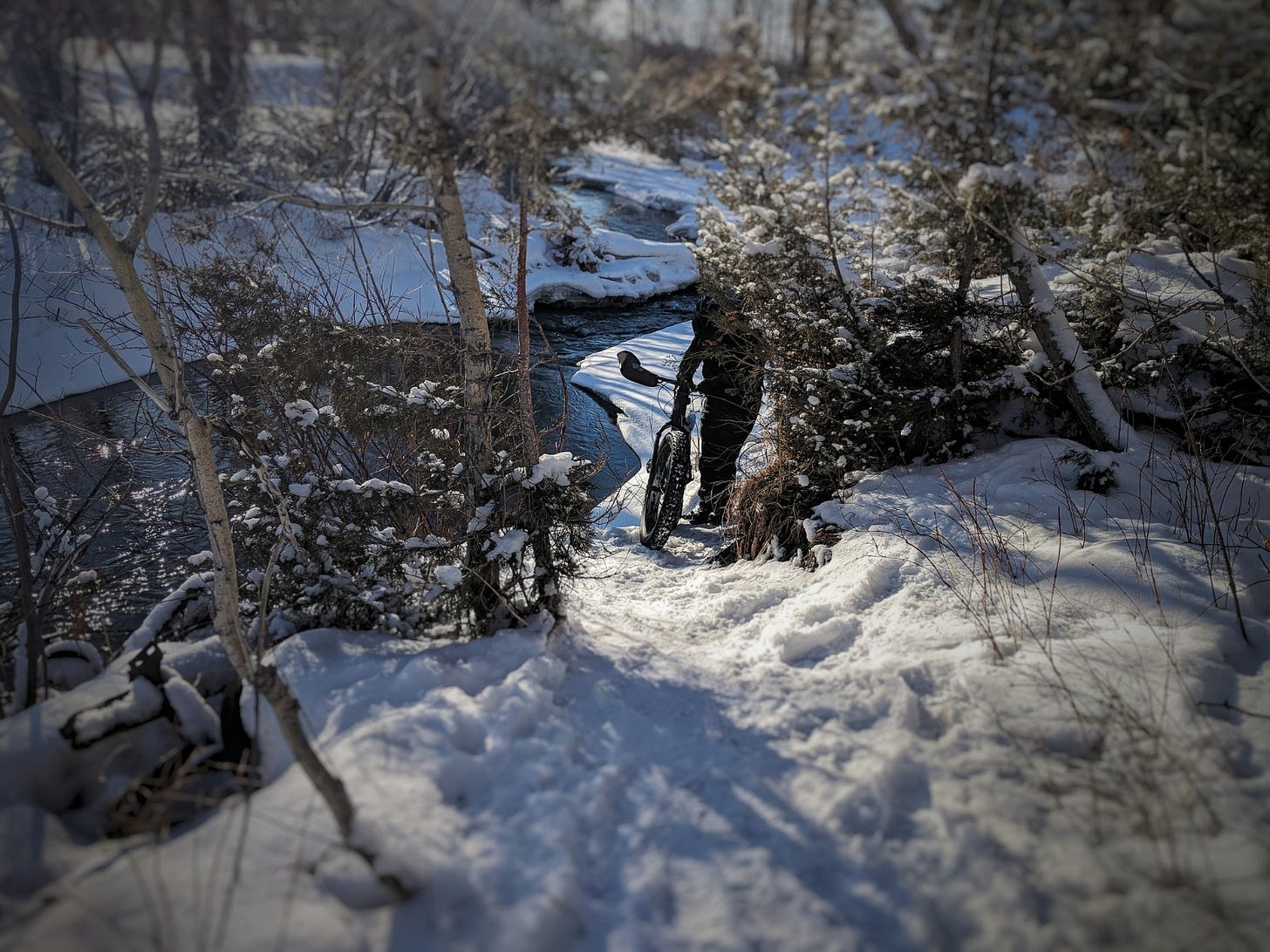 He passed the miles without passion, not hurrying, not slowly. A bag was slung in his frame like a bloated gym bag. It was full. He had progressed through this area over many years, and had reached perhaps another reality. Had he been a recognized fatbiker, he might not have even been cold. He could have watched his own body shiver with clinical, detached attention, warming its crevices and dark inner hollows only when his logic told him it must be done.