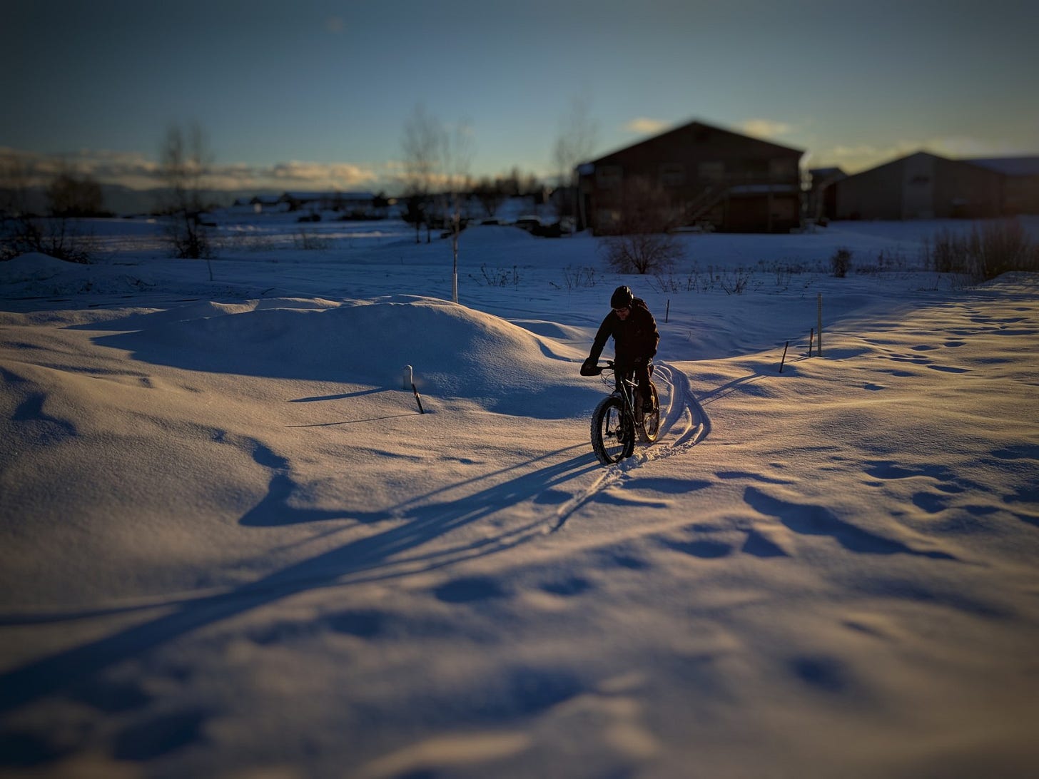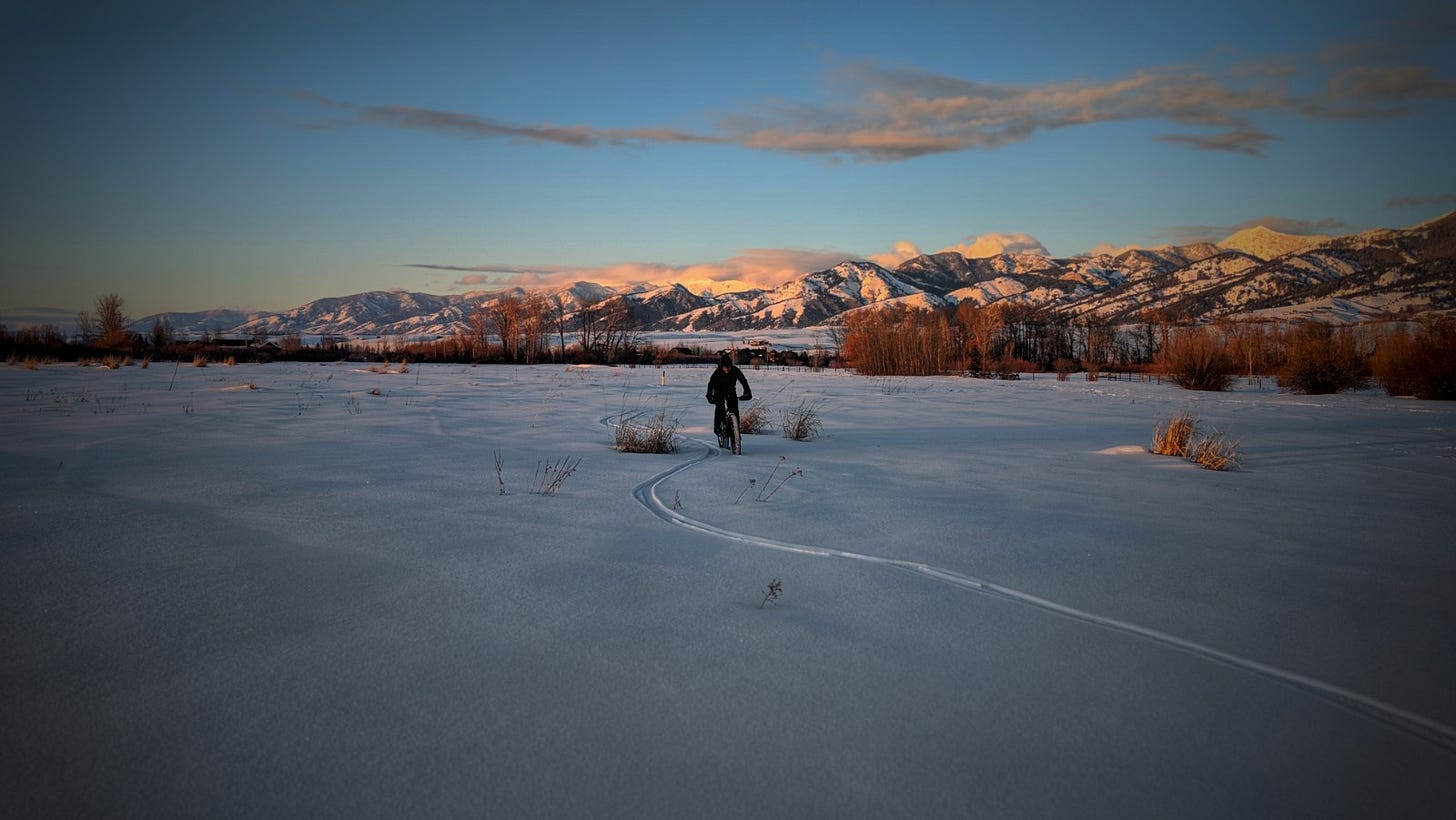 The man in black fled across the frozen valley, and the fatbiker followed.