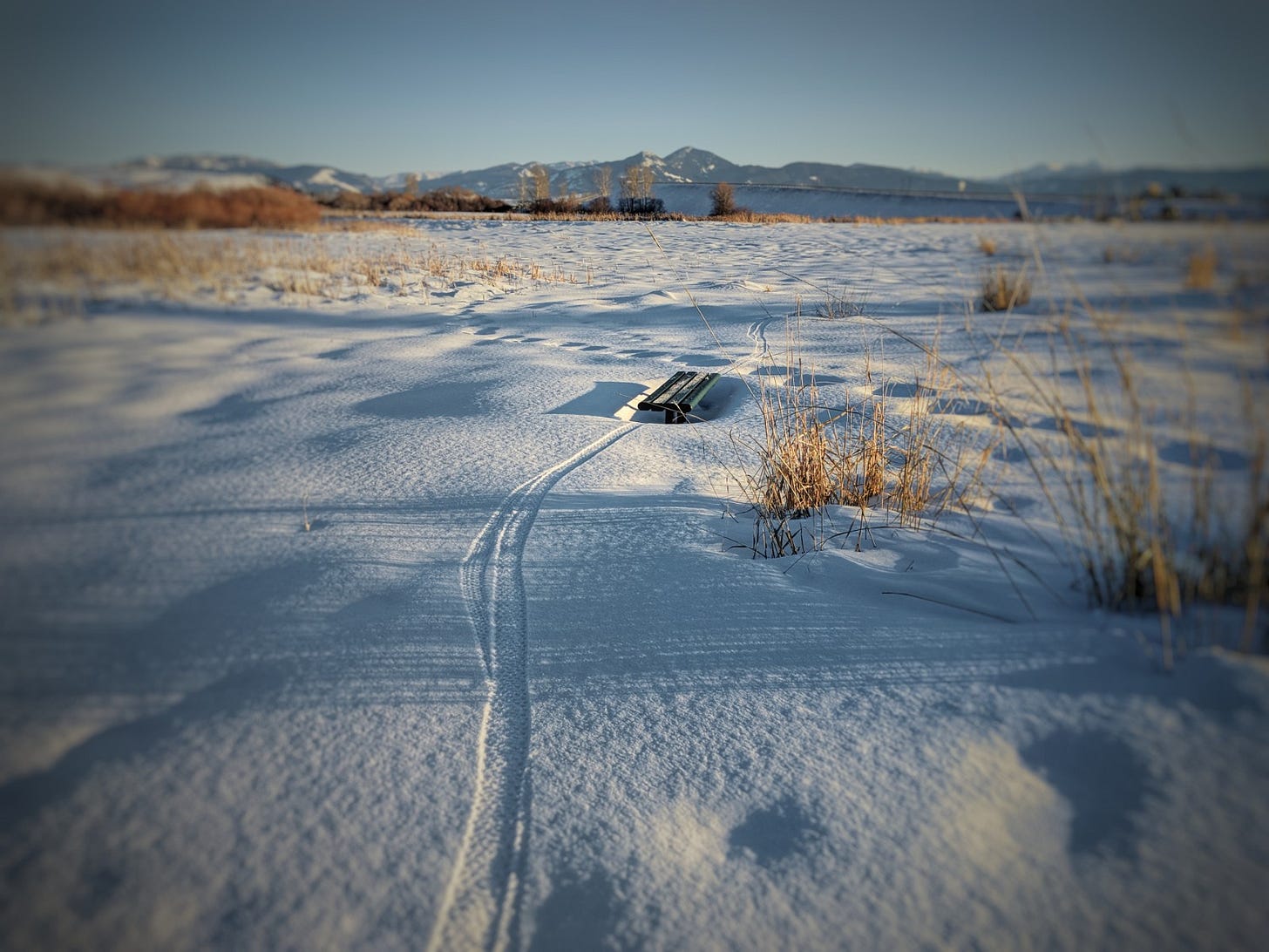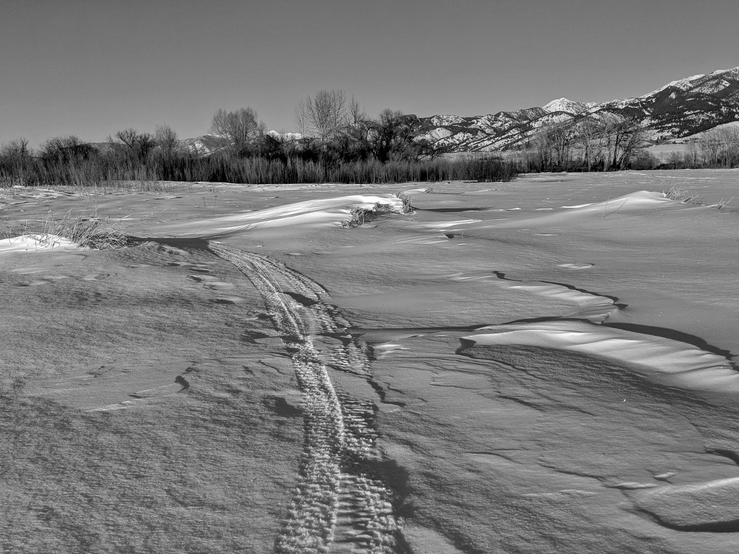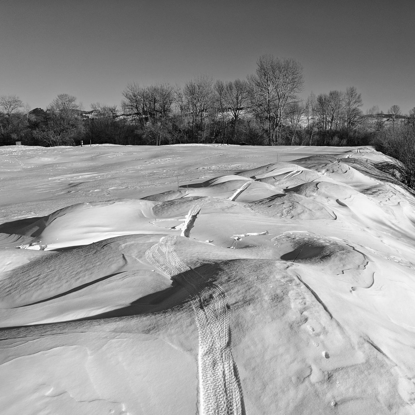 The valley was the culmination of all valleys, huge, standing to the sky for what looked like eternity in all directions. It was white, blinding, frozen, and without feature save for the small, rim of the mountains which drew themselves on the horizon. An occasional trail sign pointed the way, for once the drifted track that cut its way through the thick crust of snow had been a highway. Dog-walkers and hikers had followed it. This place had moved on since then. Everything emptied.