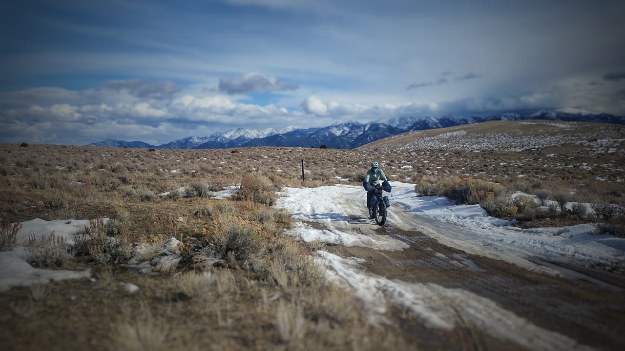 Biking was easy for a while. But then the road started to turn wet, then snowy. Eventually it was obvious why we brought fat bikes. We reached the cabin later that night. The snow was just soft enough to encourage walking the bike. Darn, it was a lot harder then we expected.