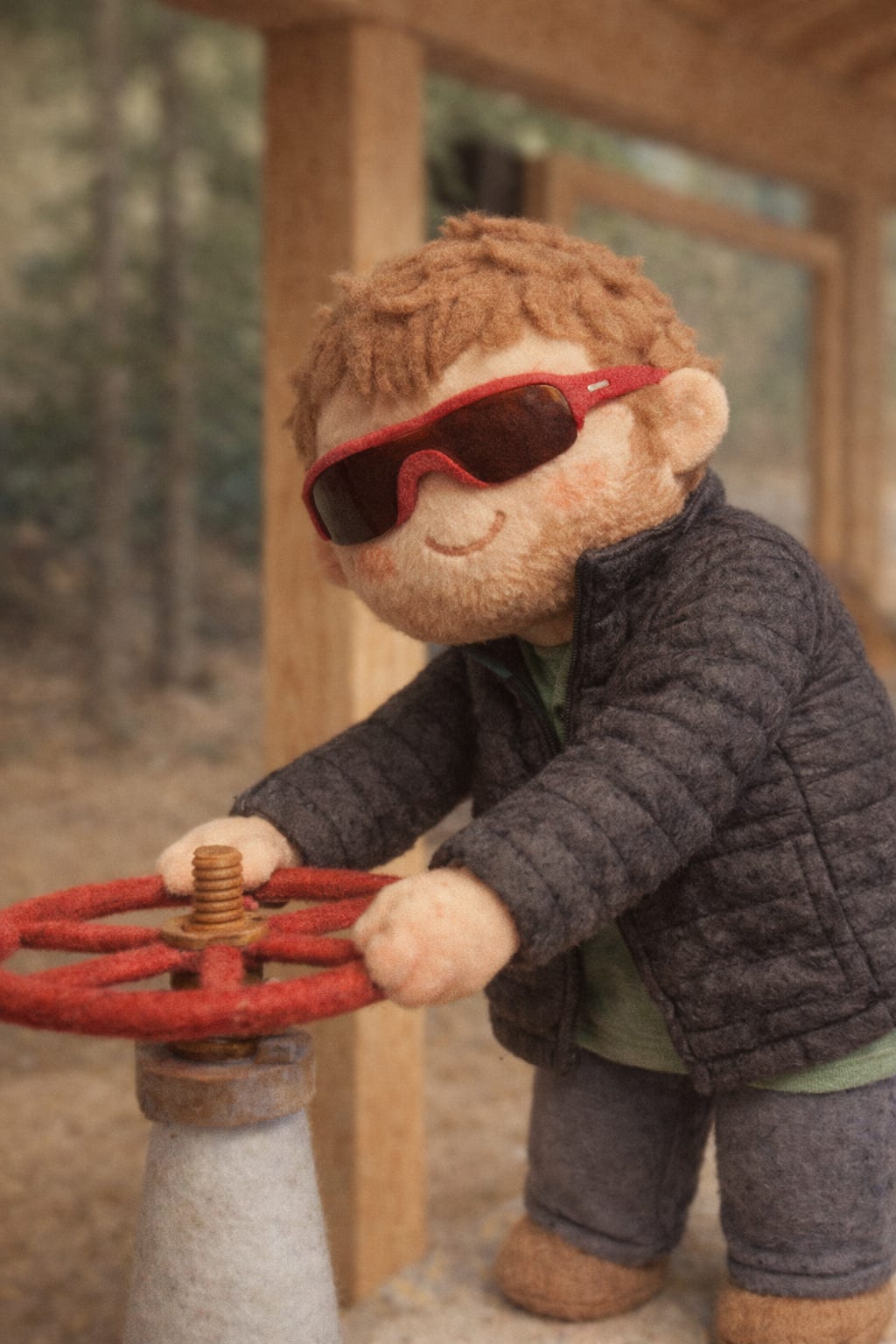 That’s when he found the old valve. Rusted, red-wheeled, bolted to some forgotten piece of infrastructure out there in the trees. It looked turnable. It was not. He grabbed it anyway, leaned in, gave it everything. Nothing. The thing was purely decorative at this point, a monument to the idea of flow with zero actual flow.