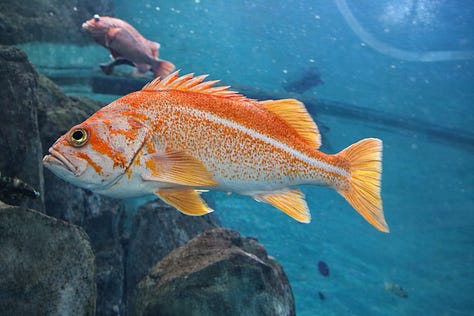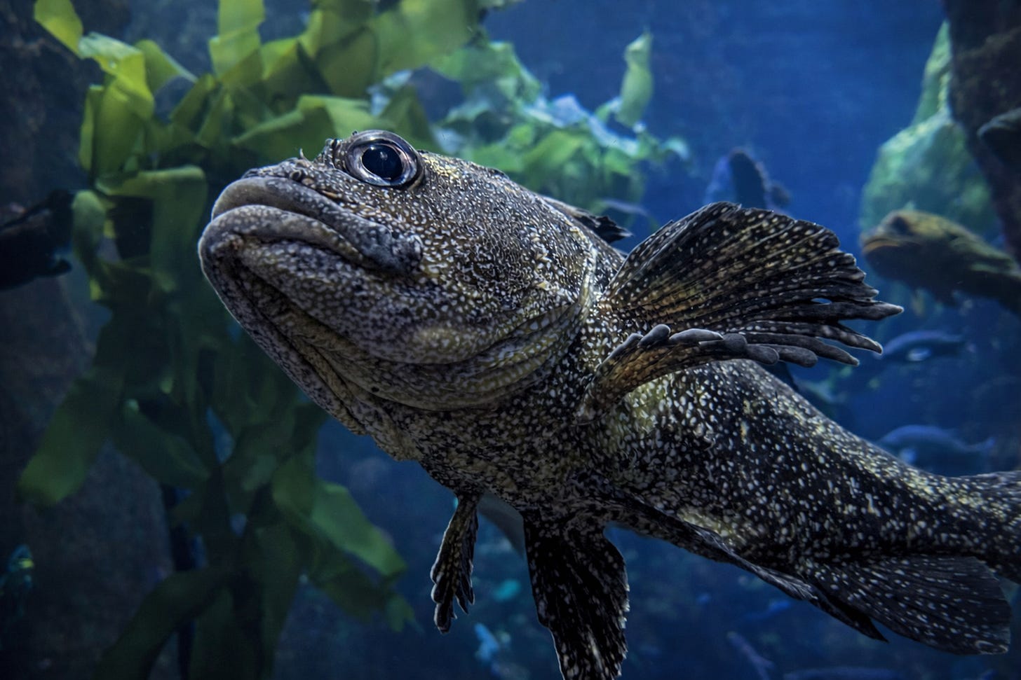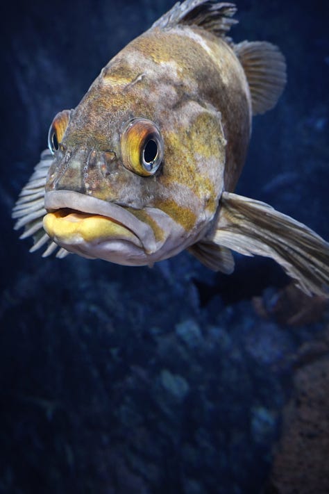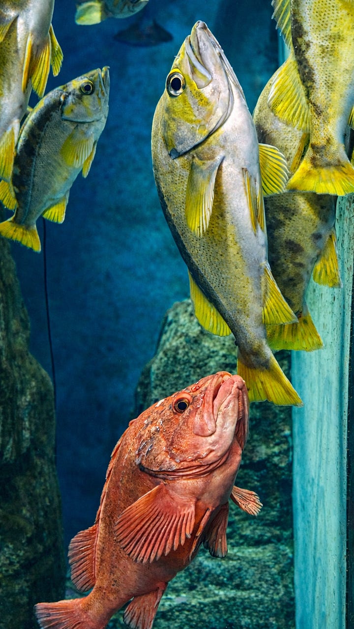 But Mo did not slow down. She sped up. The phone came out and she began snapping shots, one moment a rockfish, the next a cloud of anchovies, then something orange and prehistoric staring back like it knew us personally. I found a bench, sat down, and let the motion settle. From there, I watched Mo orbit the tanks like a happy moon. I watched fish that had never heard of vertigo glide effortlessly through curved worlds.