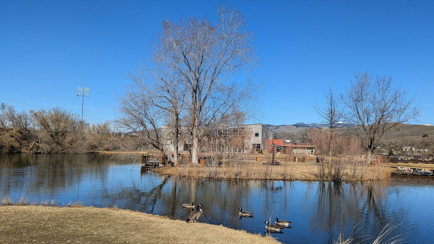So I made a small, almost embarrassingly simple change. Four blocks on the bike, and suddenly I’m somewhere worth being. Pond on one side, river on the other, a skate park full of teenagers doing things I’d never attempt on two wheels. Canada geese stationed at the water’s edge like they own the place, because honestly, they do. Missoula’s river corridor give the whole area this raw, almost unfinished feel, even in early March when the cottonwoods are still bare and the hills still carry a little snow.