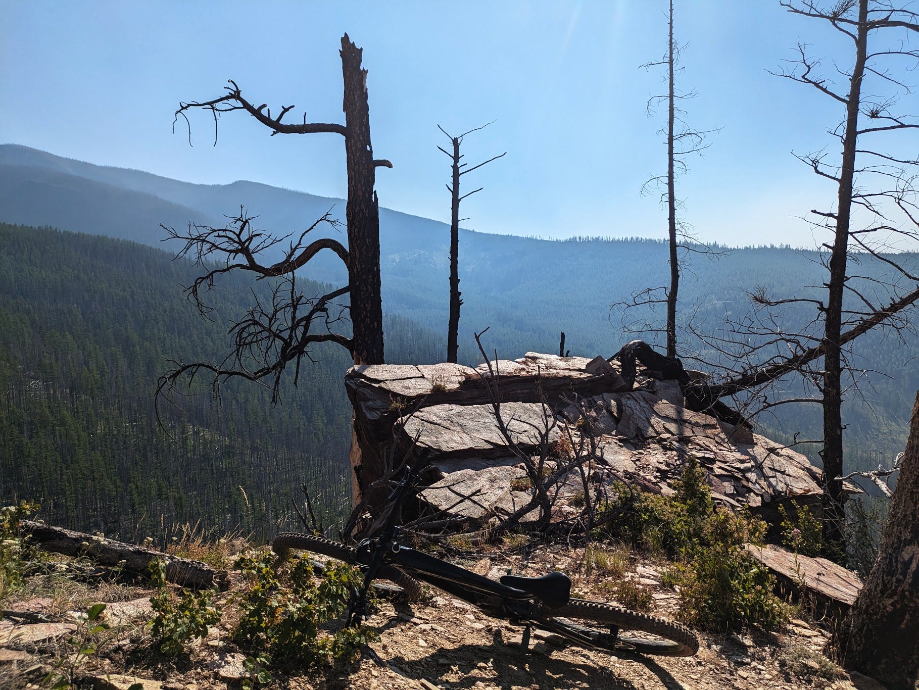 Left side: the aftermath of wildfire's harsh reality. Charred sentinels standing guard over a landscape that's been through hell but somehow still beautiful. The mountain vista stretches beyond like a blue-tinted promise that life continues. I stood on that rocky outcrop, mountain bike leaning against the stone, and felt humbled by nature's resilience. Even in destruction, there's a raw, haunting beauty that knocks the wind right out of you.