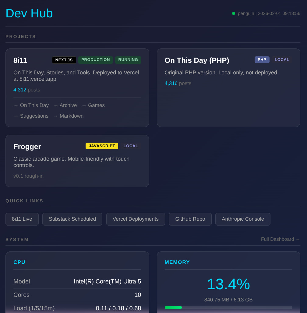 Fifteen sessions later, 8i11.vercel.app is live. Dual authentication, automatic RSS sync, a “Generate Story” button that calls Claude’s API to weave posts across years into shareable narratives. We built an archive, a markdown converter, admin tools, even roughed in Frogger. The PHP version still runs locally with full feature parity. What started as a dashboard became something I didn’t expect, a working partnership where code gets written and I actually learn why it works.