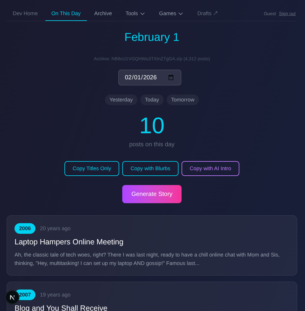 So naturally I pushed harder. Take my local “On This Day” script, the one that pulls posts from twenty years of Substack archives, and put it on the actual internet. Simple enough, right? Except Vercel doesn’t speak PHP. So we rewrote everything in Next.js. Then Vercel shuffled Postgres off to paid partners mid-project, forcing a pivot to Turso. The 4.5MB upload limit meant reimagining how to import 4,000+ posts through batched uploads and client-side zip extraction. Timezone bugs showed tomorrow’s posts when Vercel’s UTC servers got confused. React hydration errors broke buttons in ways that felt personally vindictive. OAuth callbacks demanded exact URL matching or nothing worked at all.