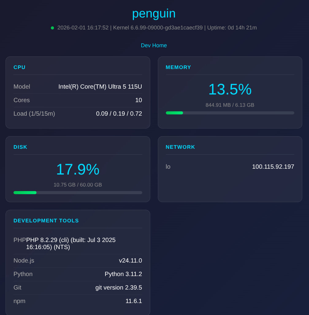 Mid-January, I installed Claude Code on my Chromebook Plus just to see what would happen. The first ask was simple: build me a system dashboard. Within minutes, a single PHP file appeared, dashboard.php, showing CPU stats for my Intel Core Ultra 5, memory bars filling in green, disk usage, network interfaces. It auto-refreshed every ten seconds. No frameworks. No dependencies. Just php -S localhost:8080 and there it was, alive on screen. That was the moment I understood this wasn’t fancy autocomplete. This was something that could actually build things.