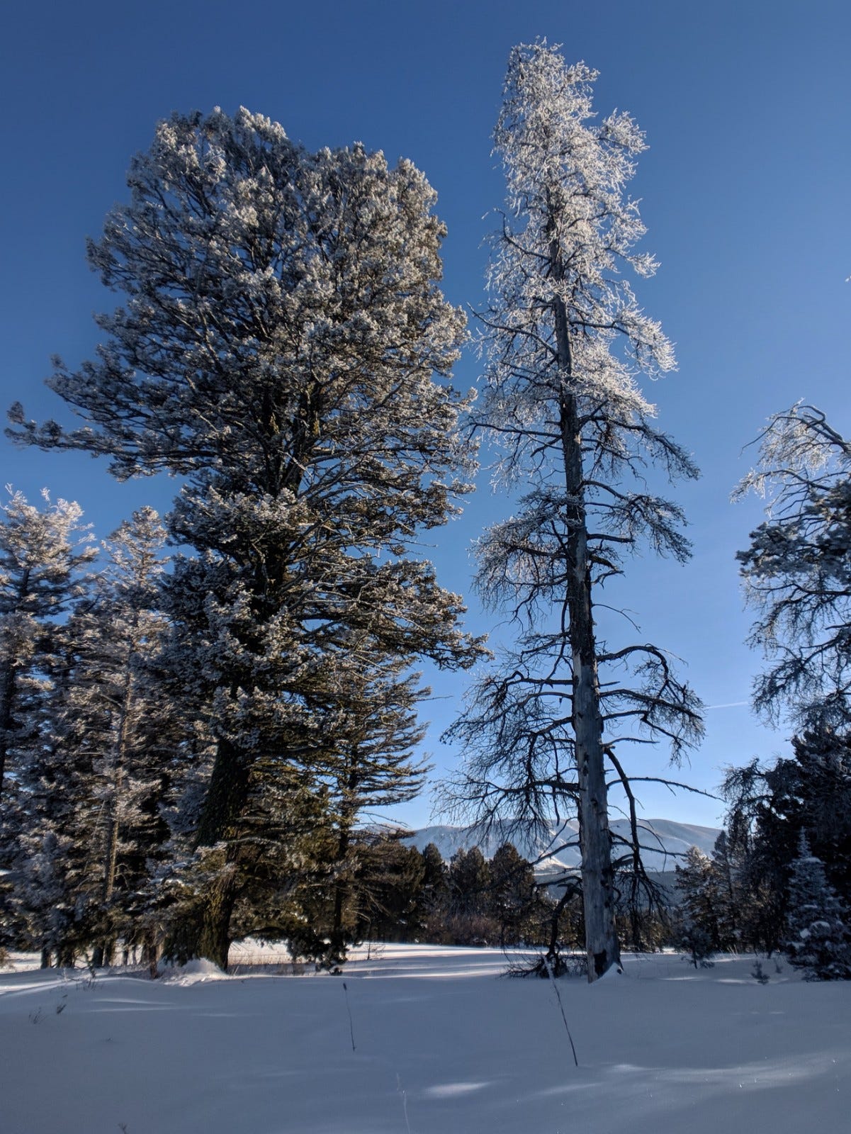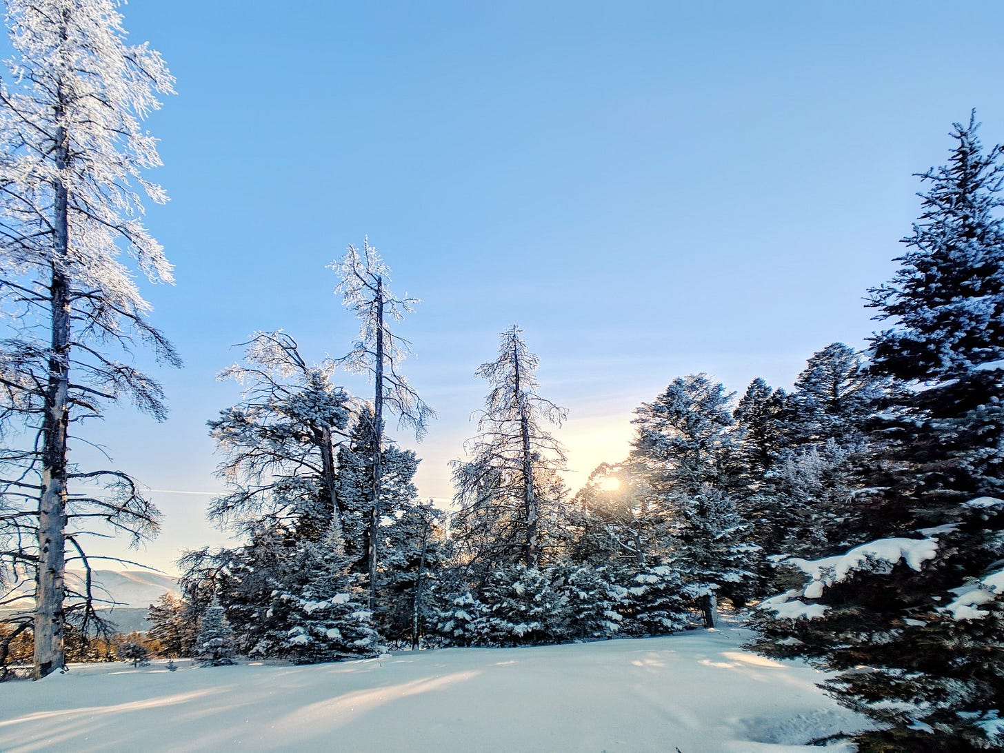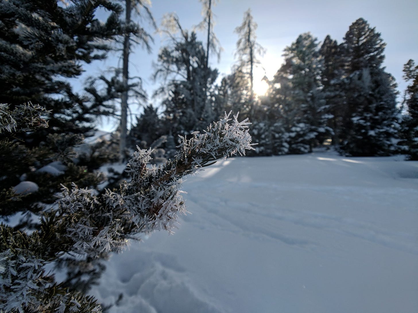 The detour took us up to the top of a ridge where the hoar-frost covered everything. And as a big bonus, the sun was low behind the scene. I started snapping off photos.