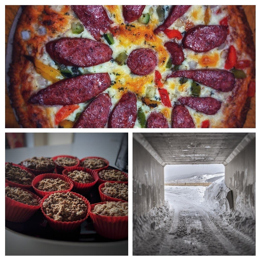 This mash-up screams "hunker down mode: activated" - like wrapping yourself in a quilt of the most soul-hugging homemade pizza, the kind of muffins that make you forget the world outside exists, and a path so snow-kissed it could be a holiday card. It's a visual feast that whispers (or maybe shouts, if you're hungry) about finding that sweet spot of comfort and indulgence when the great outdoors feels more like a scene from a dramatic survival movie.