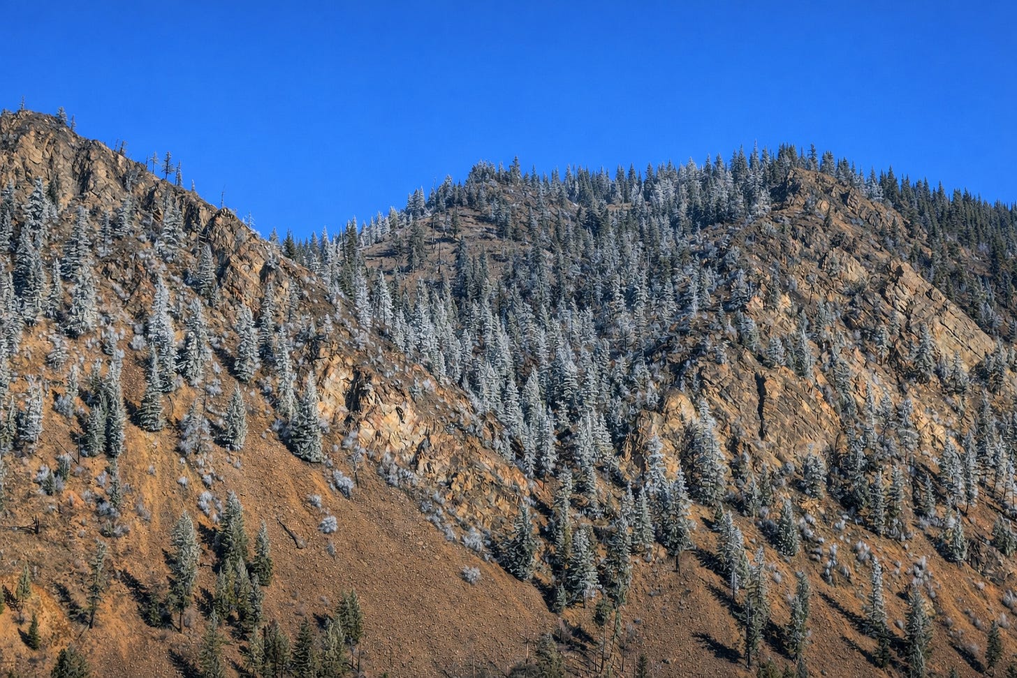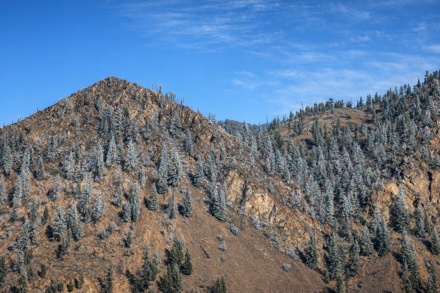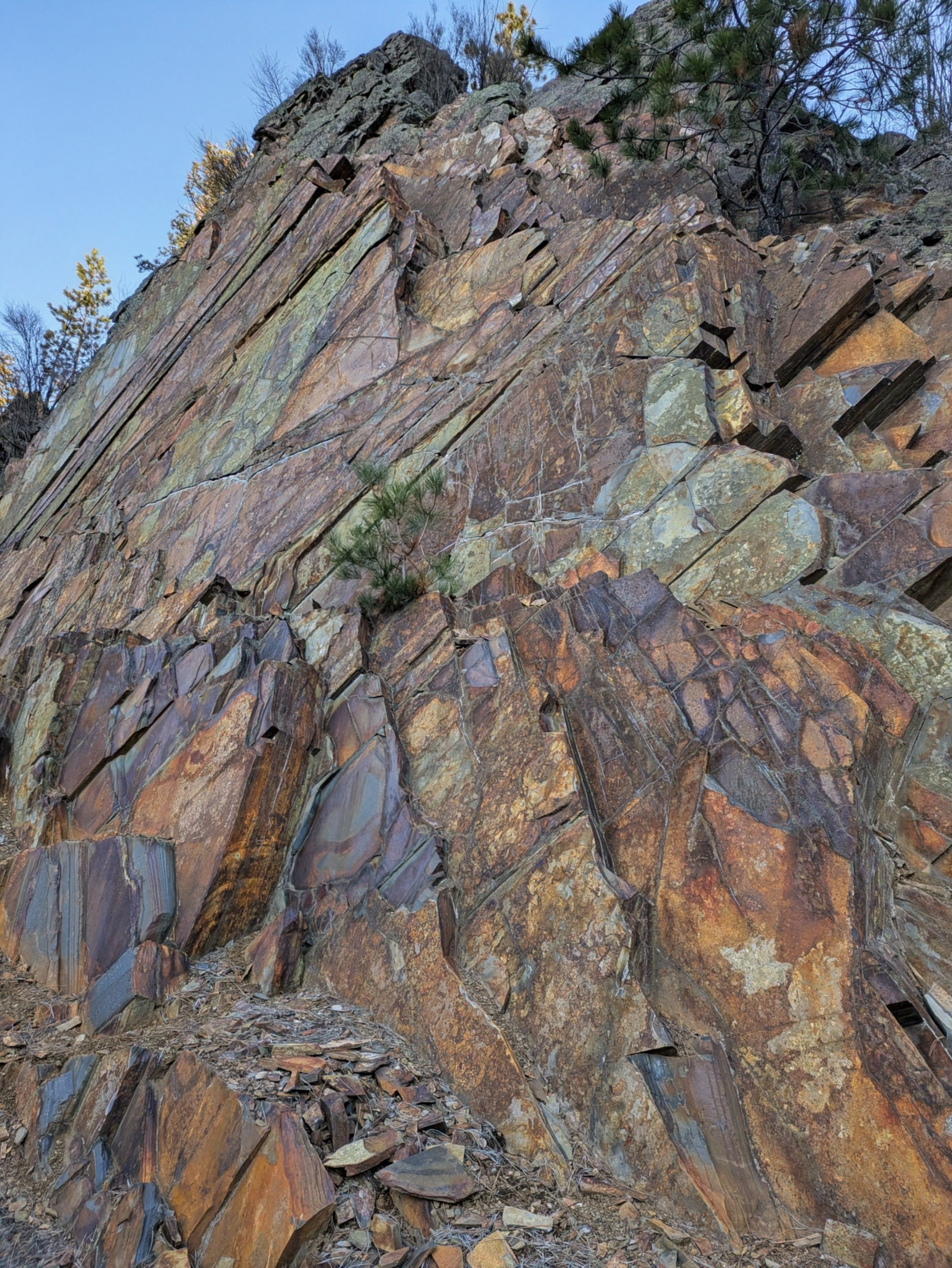That rock face we found, though... tilted layers of rust and green and purple, ancient sediment pushed sideways by forces that don’t care about your mood. Little pines clinging to cracks where nothing should grow. The geology doesn’t ask permission. It just exists, indifferent to the season, indifferent to our problems.