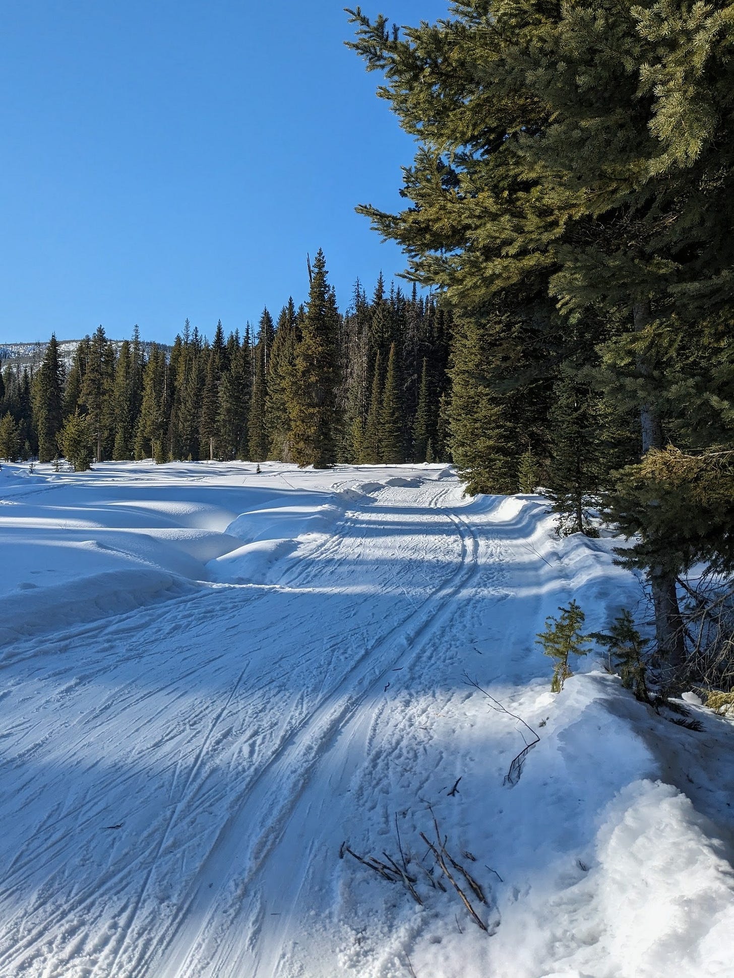 We rolled into Lolo Pass with that quiet confidence you only get when the plan is simple and the stakes are low. Mo took off with her shuffler skis like she was clocking in for work. I swung a leg over my fat bike, already negotiating with myself about traction, sliding, and dignity. The trail was freshly groomed, corduroy perfect, winding through dark trees that held the cold like a secret. The numbers later would say fourteen and a half miles, some climbing, respectable effort, but at the time it was just breath, snow, and the soft hum of tires doing their thing.