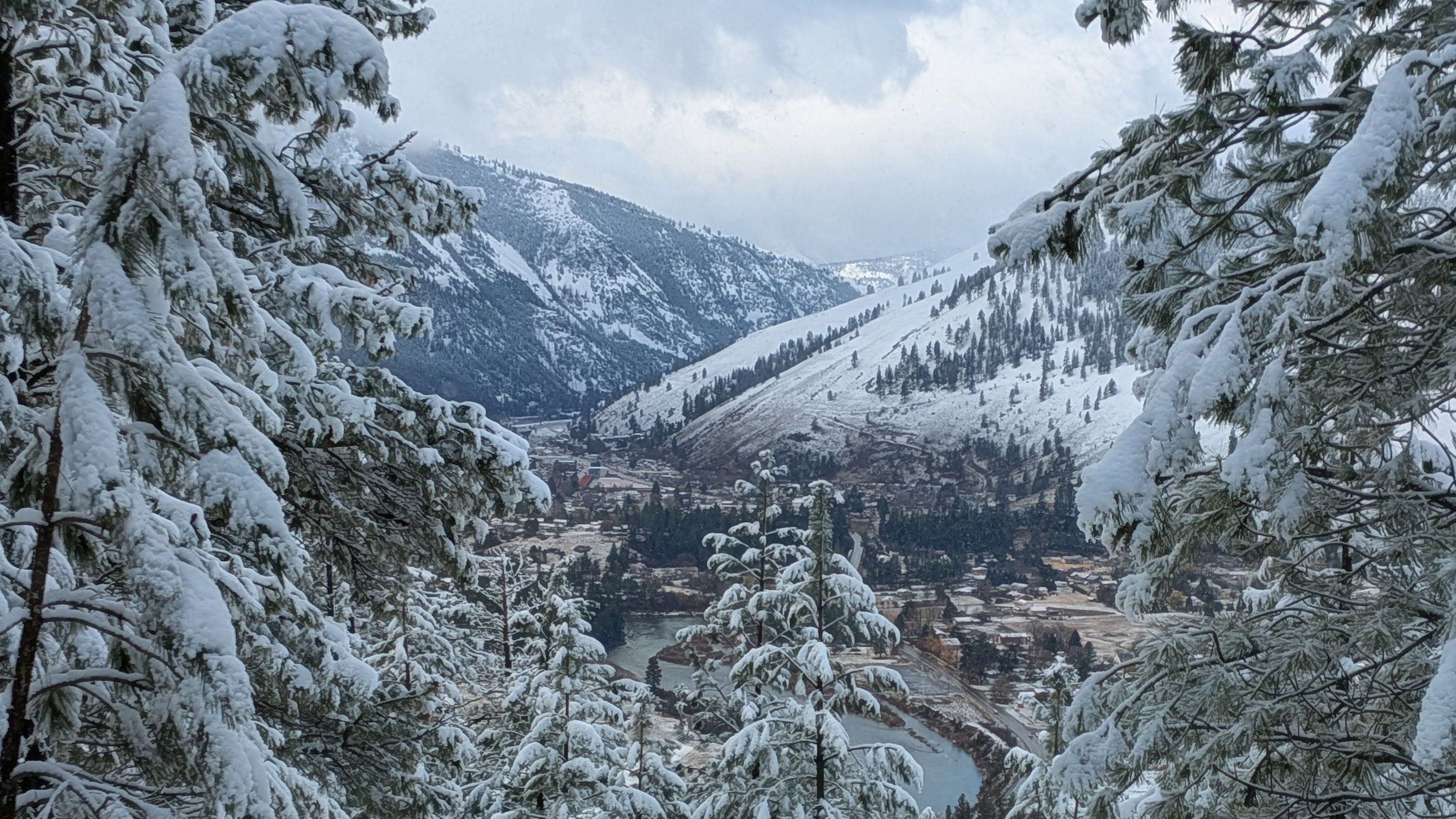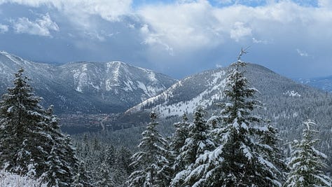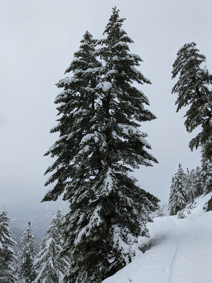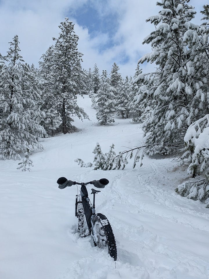 Marshall Mountain it was, then. Rode my bike up the hill the normal way, same as always. Things looked promising for a while. The snow-covered pines were doing their whole silent cathedral thing, and honestly it was worth showing up just for that. But I kept going when I should have stopped, which is a recurring theme in my life across multiple categories. Half an hour in, I was walking the bike, post-holing through knee-deep snow, asking myself the obvious question.