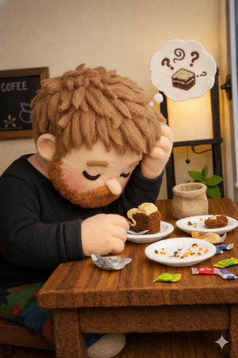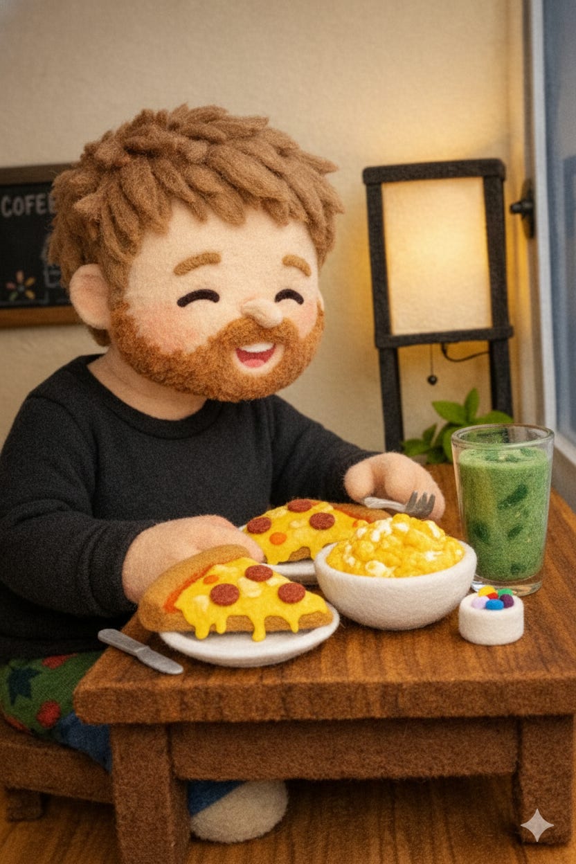 Last night I came off a 48 hour fast feeling like a monk who just got handed the keys to a casino buffet. Calm, focused, suspiciously peaceful, and then I decided it was time to eat, like really eat. I preheated the oven with the seriousness of a NASA launch, loaded up pizza with extra cheese and extra sausage, and thought, sure, while that’s cooking I’ll just whip up scrambled eggs. Because why stop at one main character when you can cast the whole ensemble. Then I built my daily smoothie, two cups of yogurt, a heroic handful of arugula, vitamins, powders, the usual witchcraft, and I stood there like, look at me, I’m basically health. February 25th’s Eternal Loop