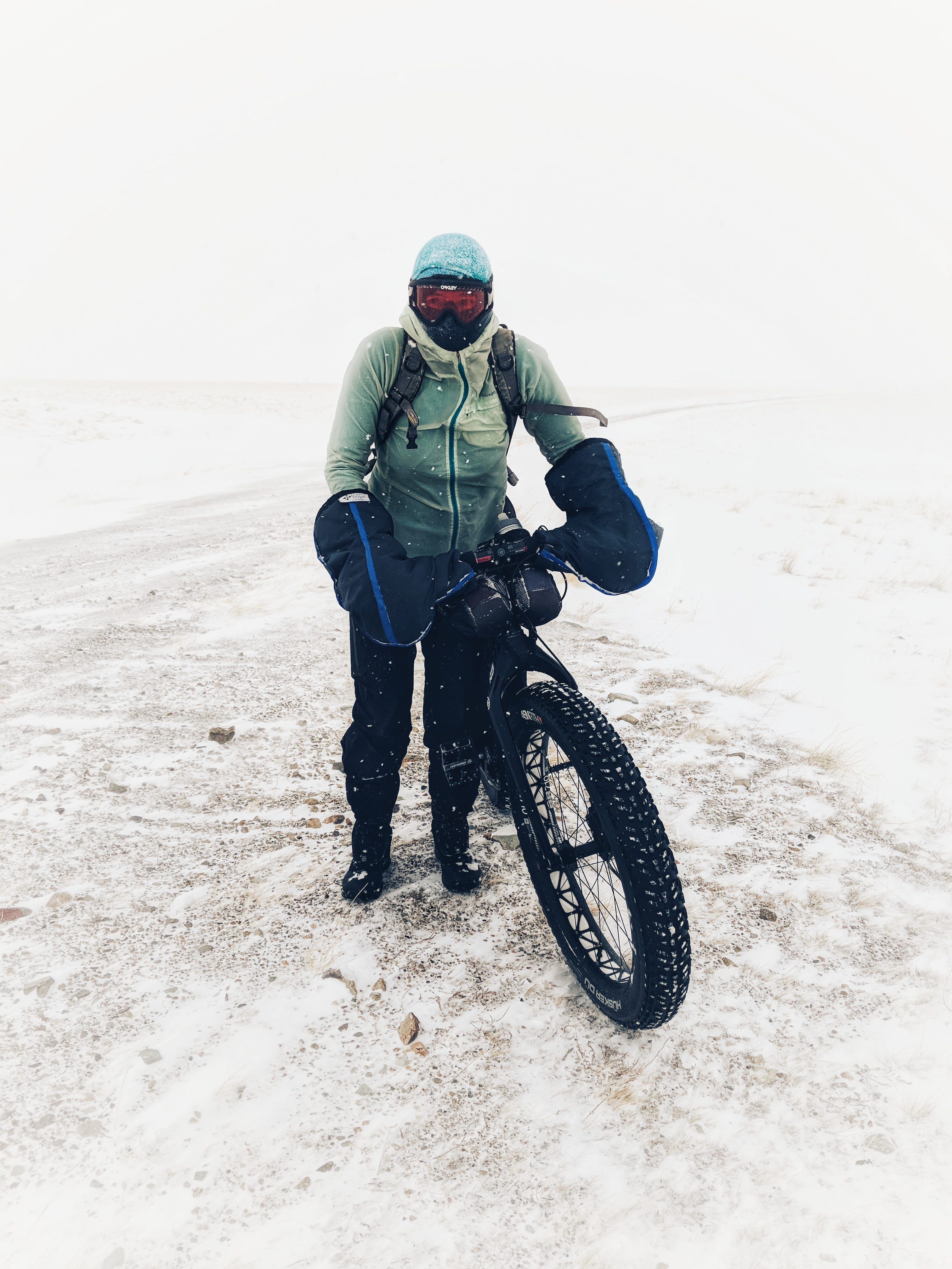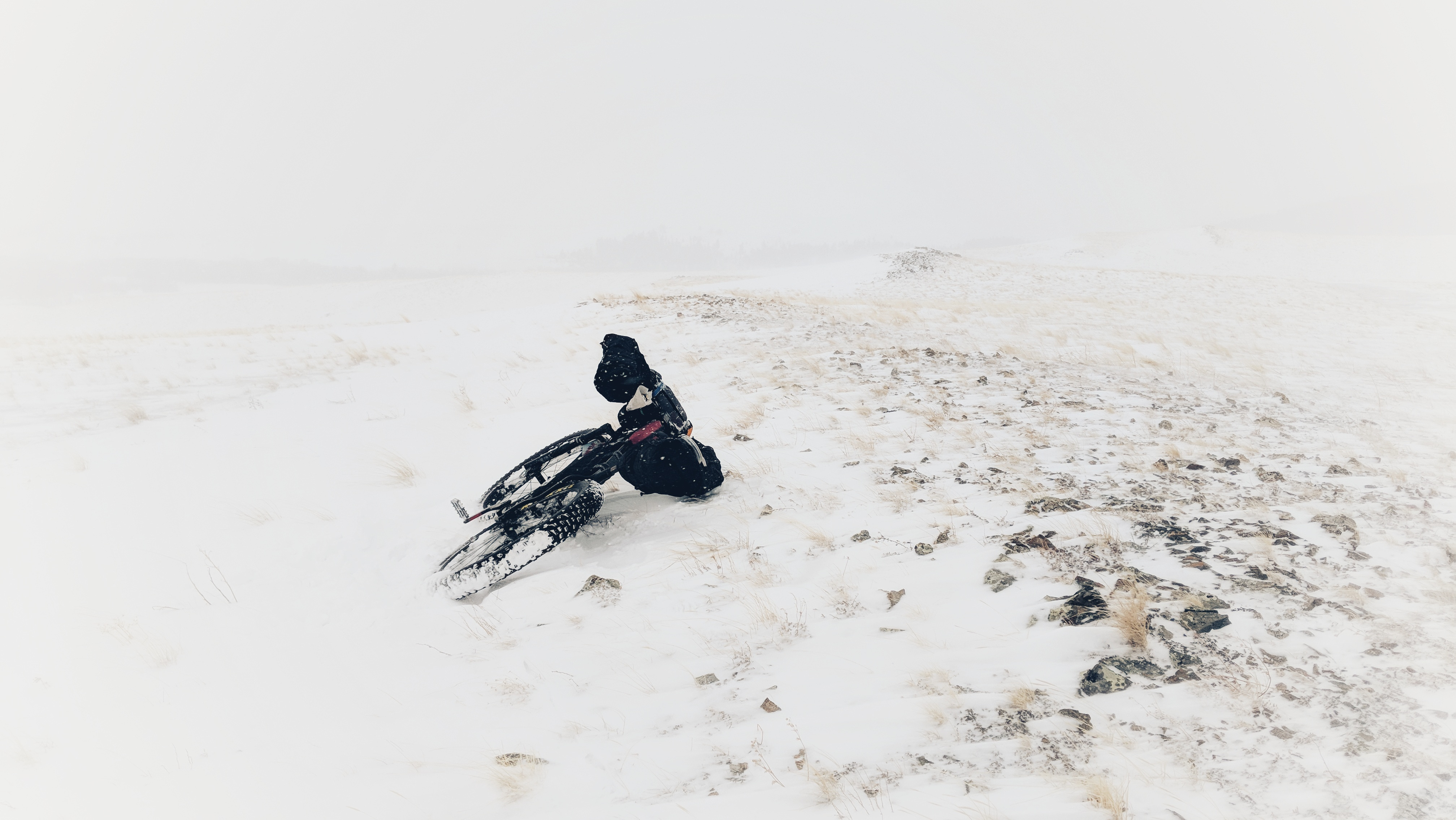 At one point we stopped and snuggles informed me that she was NOT comfortable with the conditions. High winds had windswept the grassland in sheer ice. My comfort level was good so we decided upon a "take a look at what is around the next corner" approach. As I went around that corner everything vanished. A black cloud scrapped over the ridge and snow started to dump like a Zamboni emptying out. Then the wind gust hit me and knocked me to the ground. I headed back.