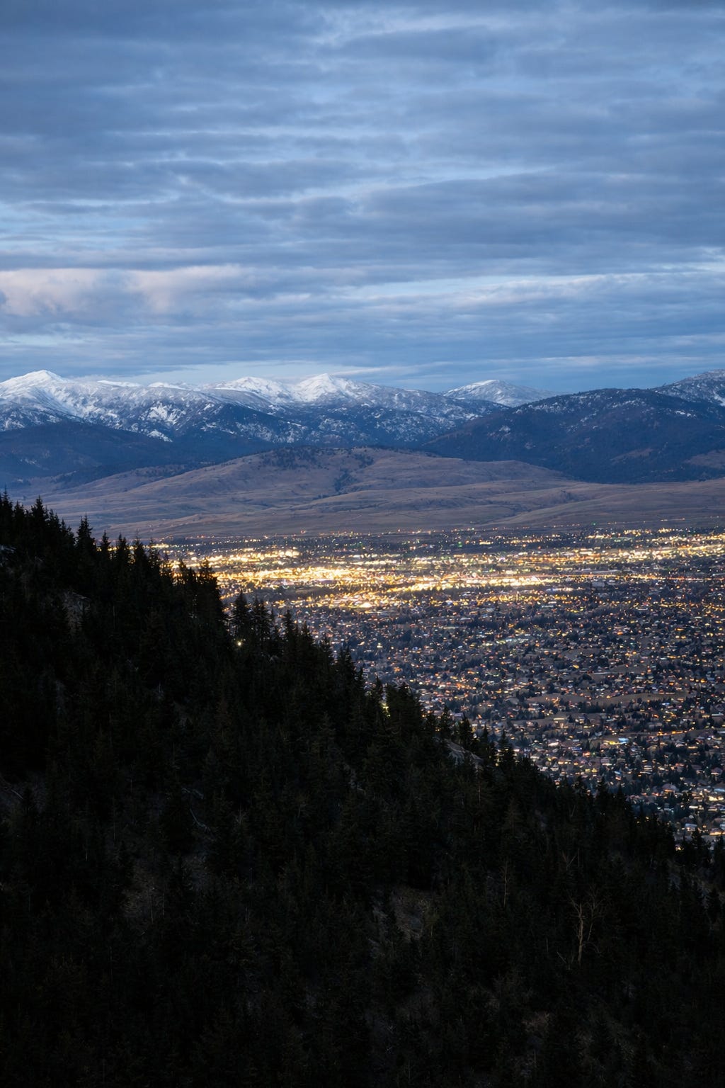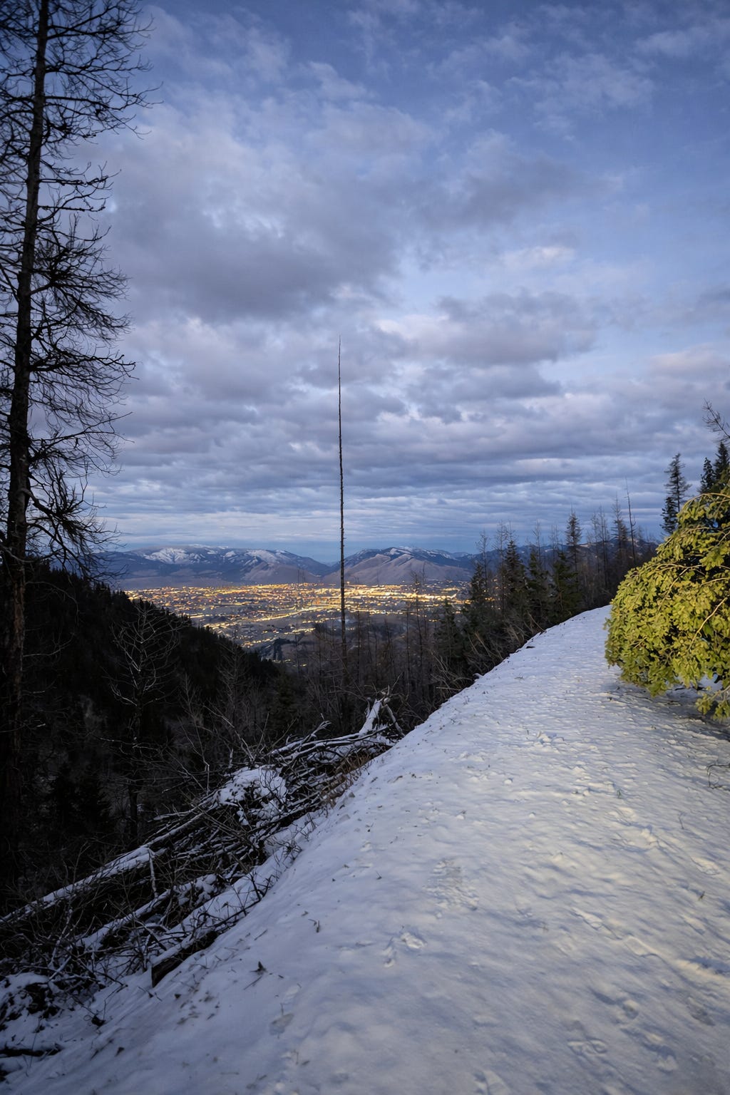 I did make it to the point, Hayes Point. Doesn't matter. Somewhere up on that snowy slope, the city started twinkling below like someone had scattered Christmas lights across the valley floor. The clouds hung heavy but parted just enough to let that strange dusk glow through, almost moonlit, almost magical. The snow crunched under my tires. The trees stood there like they always do, patient, unbothered by whether it's twenty degrees or fifty. Good friends, those trees. They don't cancel plans when the weather shifts.