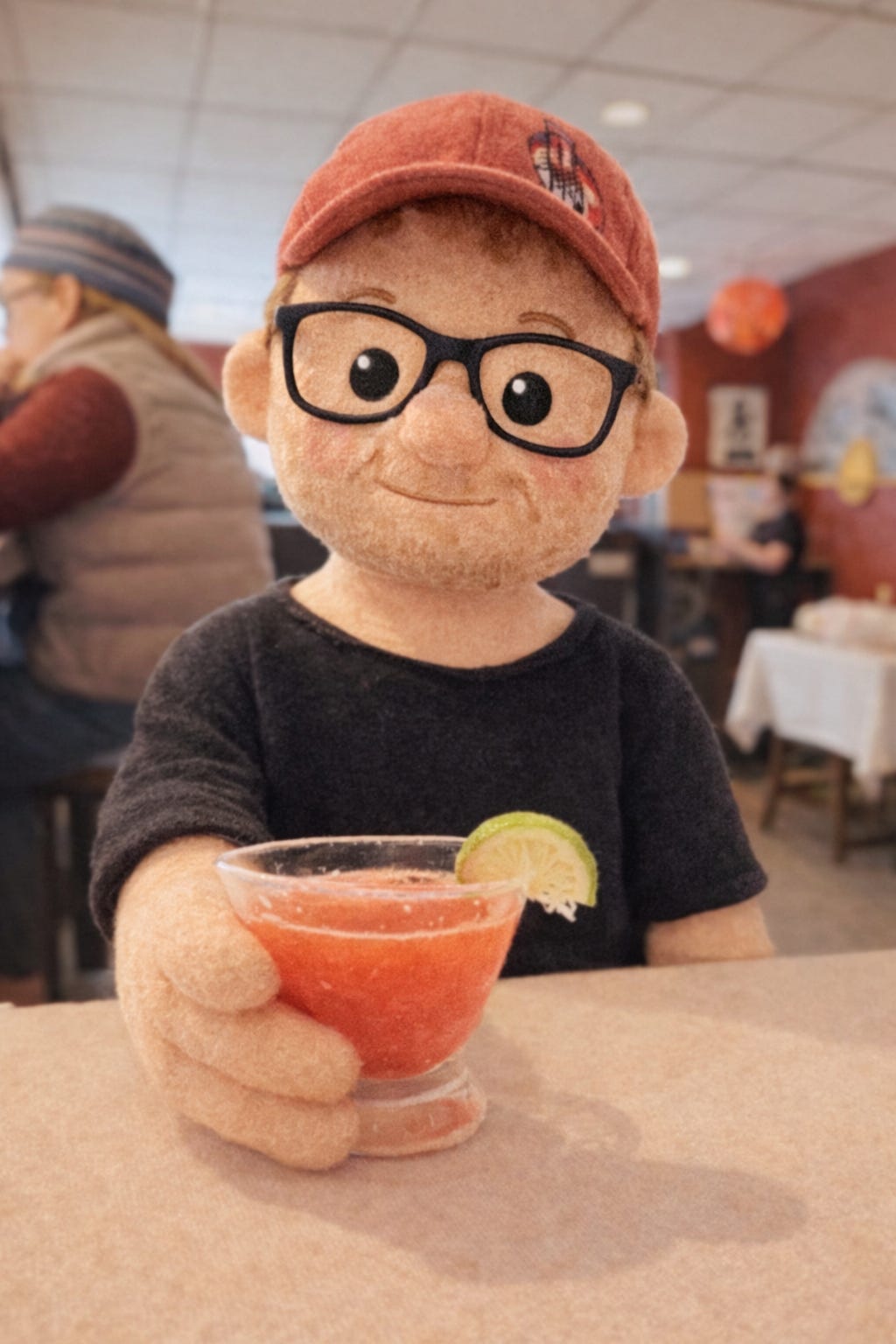 So today is different. Today is slower. And if that little felt guy holding a strawberry margarita in a plastic cup looks like he's earned it... well, same. There's something deeply correct about a puppet in glasses and a ball cap sitting at a restaurant table like he's got nowhere to be. He gets it. Recovery sometimes looks exactly like that: just sitting somewhere unremarkable, holding something cold, not performing okay for anyone.