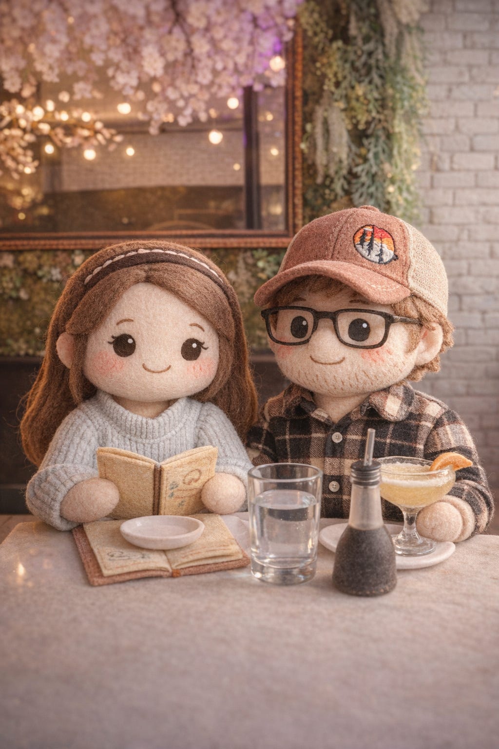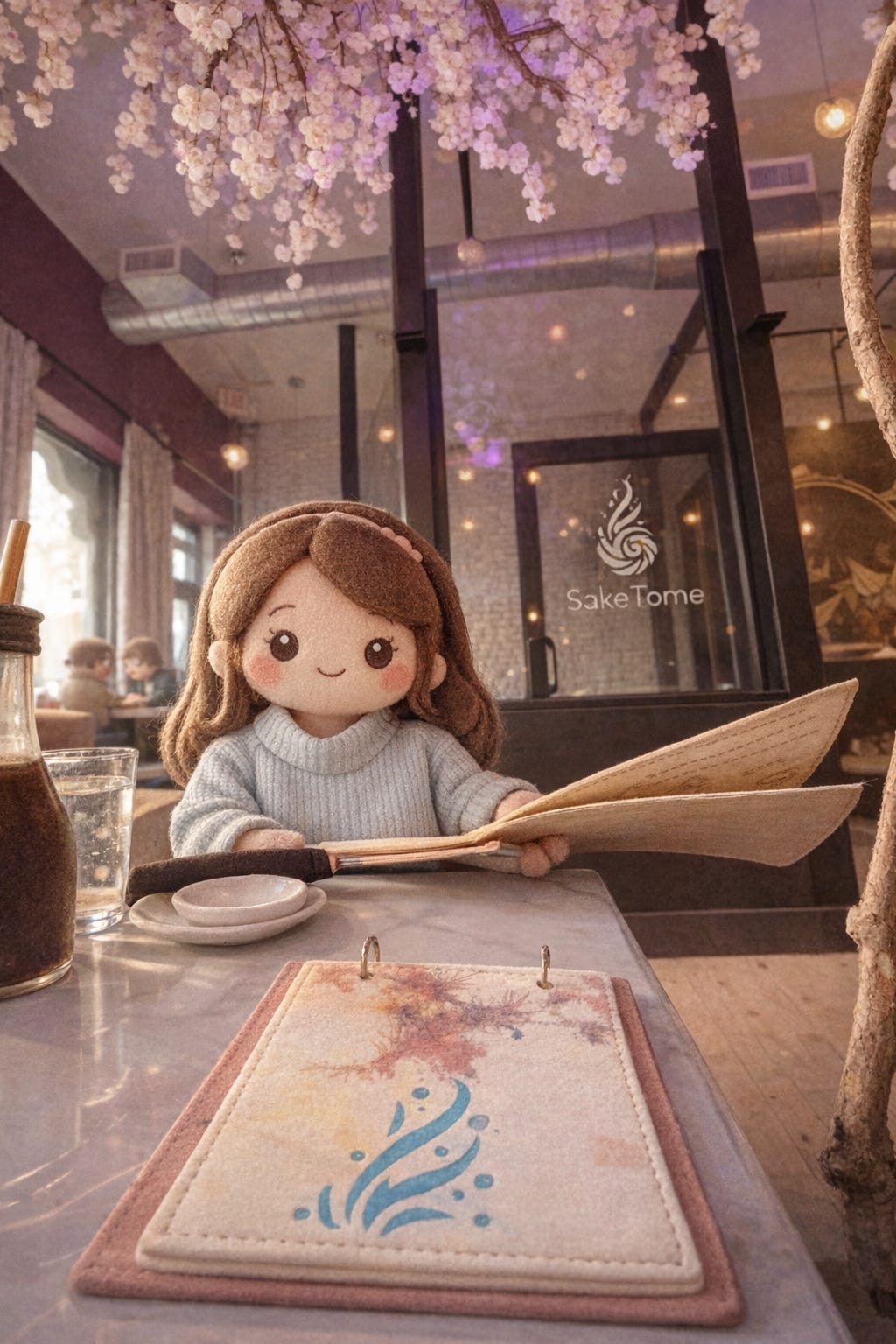 SakeTome does this thing where the whole room feels like it’s inside a cherry blossom, lights strung everywhere, pale pink blooms cascading from the ceiling like they grew there on purpose. I had my cocktail, garnished with a little dried orange slice because of course it was. I sat there turning pages like I was reviewing important documents, which felt right.