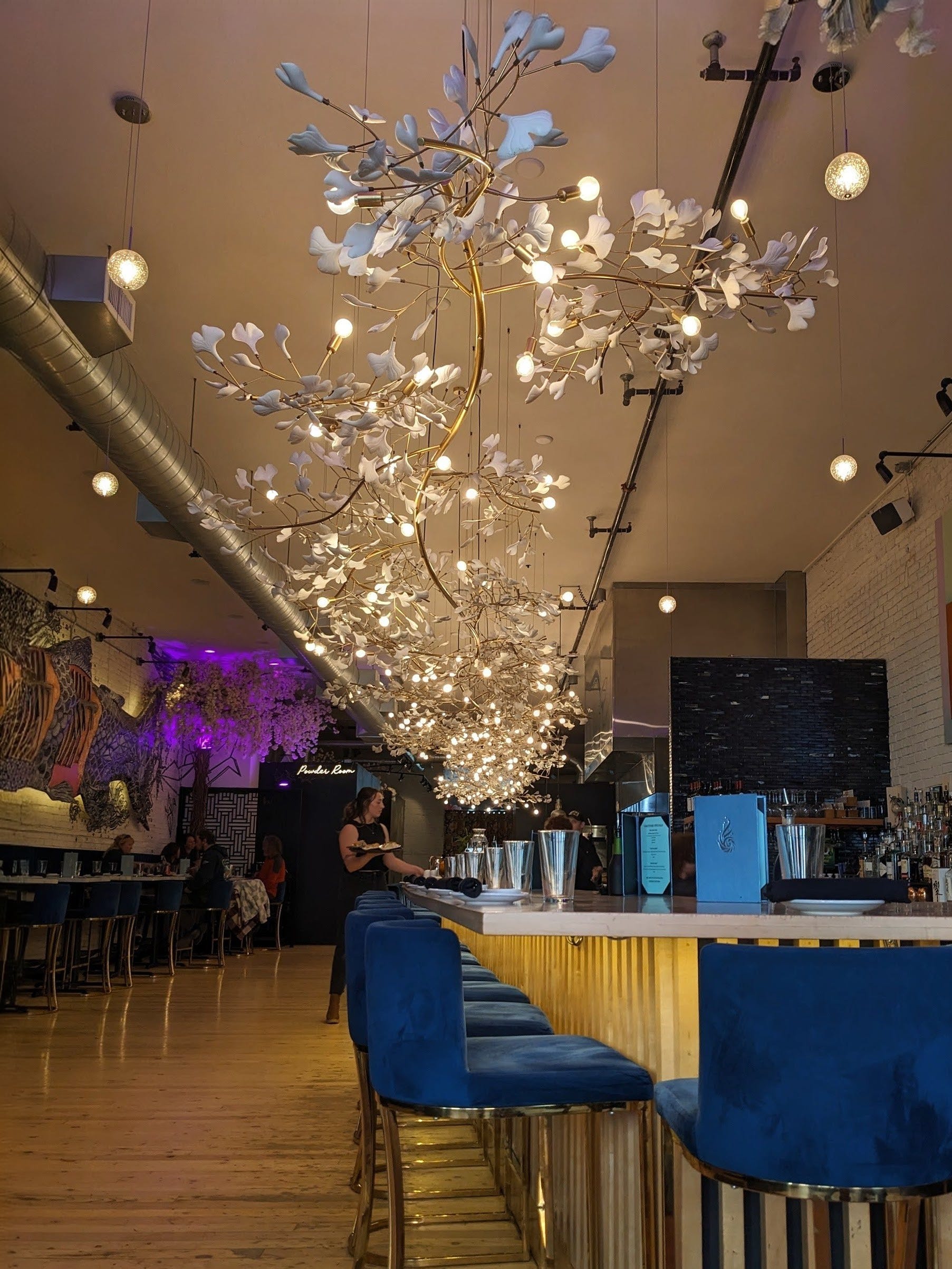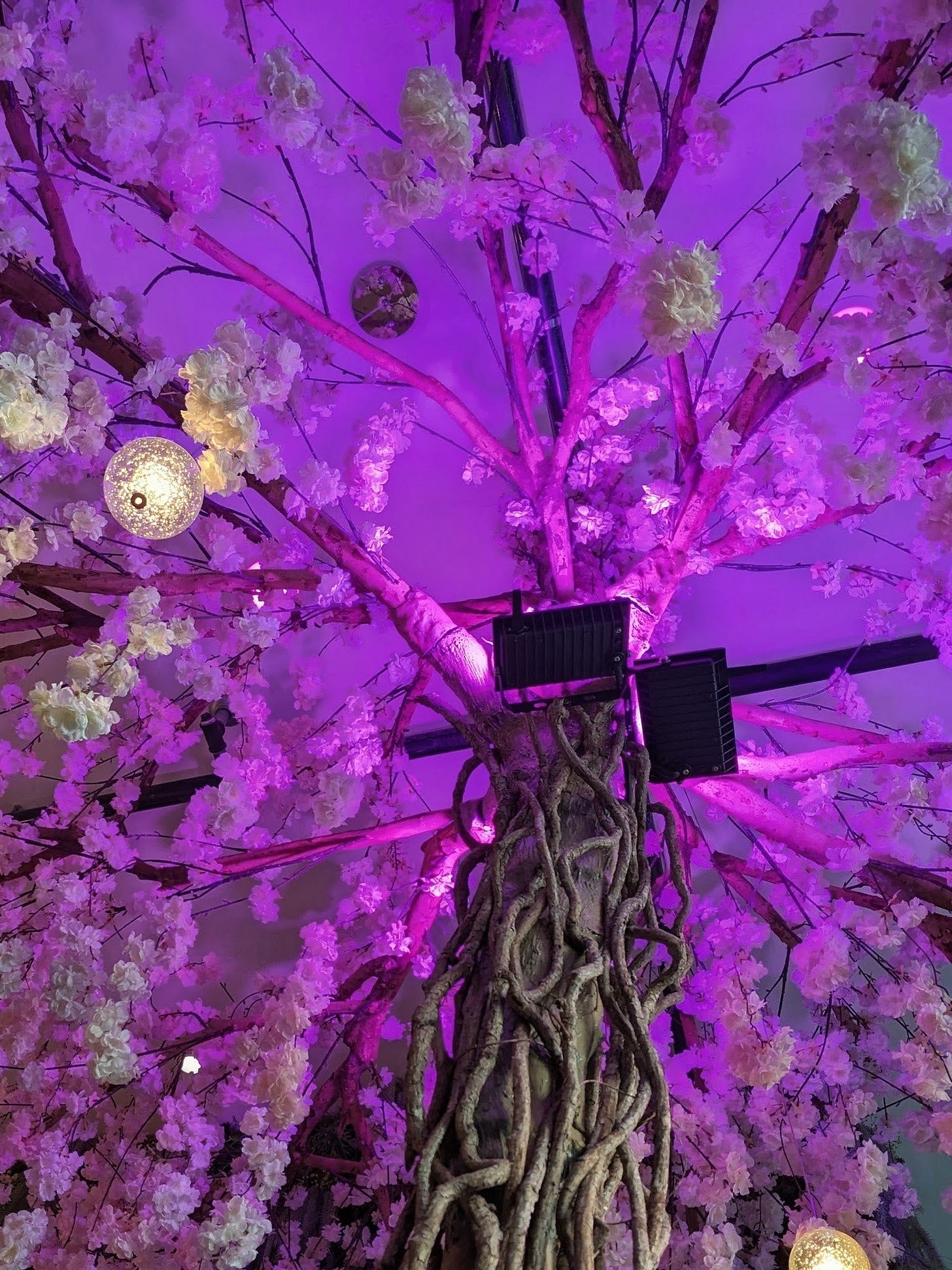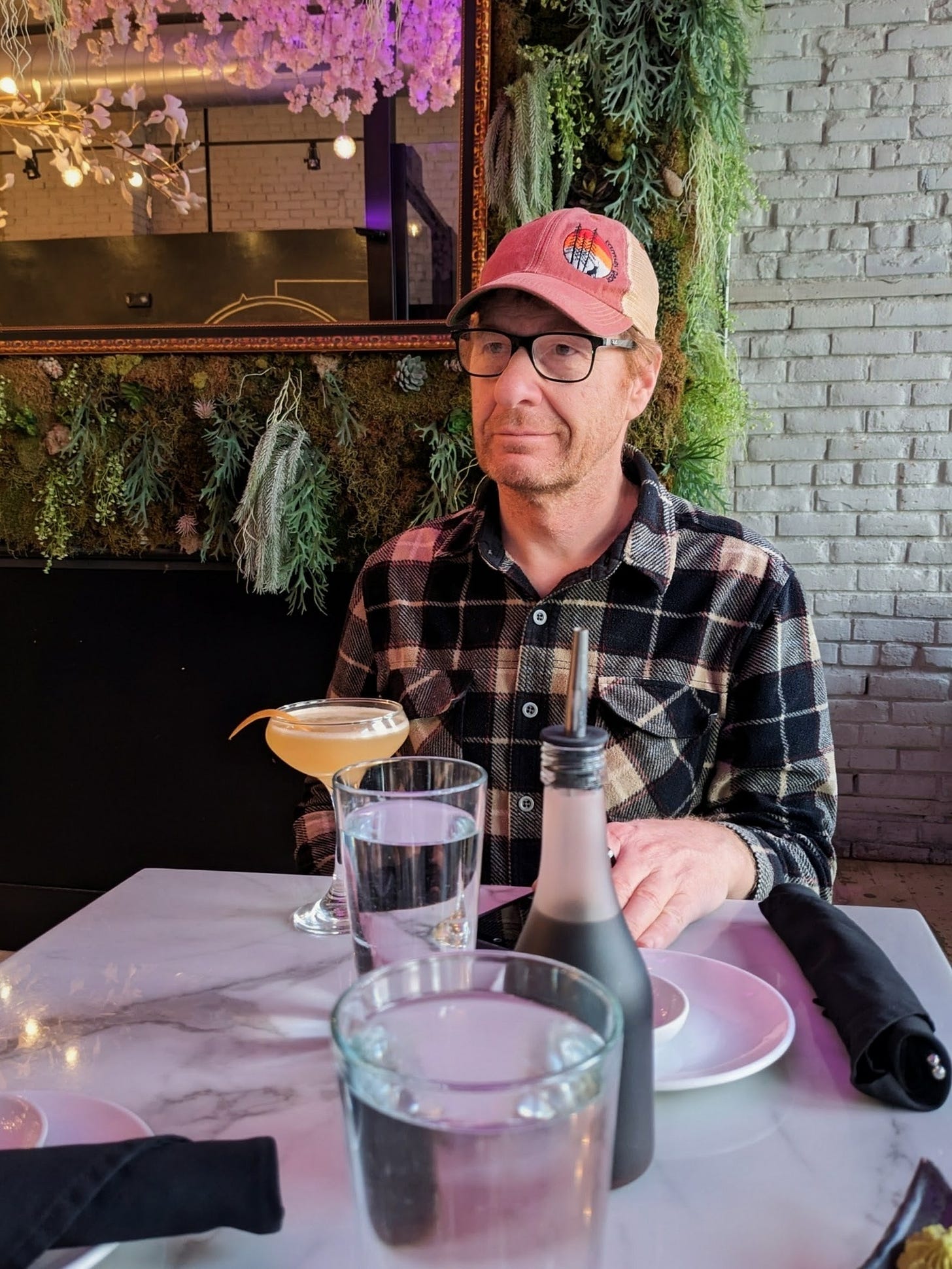 There’s something quietly magnificent about getting dressed up... which, in this case, means a flannel shirt and a trucker hat... and walking into a place with a purple-lit tree growing through the ceiling and cocktails arriving in coupe glasses with little orange garnishes. Mo and I sat in a room designed to make you feel like you stumbled into an enchanted forest after a very good day, and for a couple of hours, that’s exactly what it was. Regulated. Connected. Present. I wanted to bottle it.