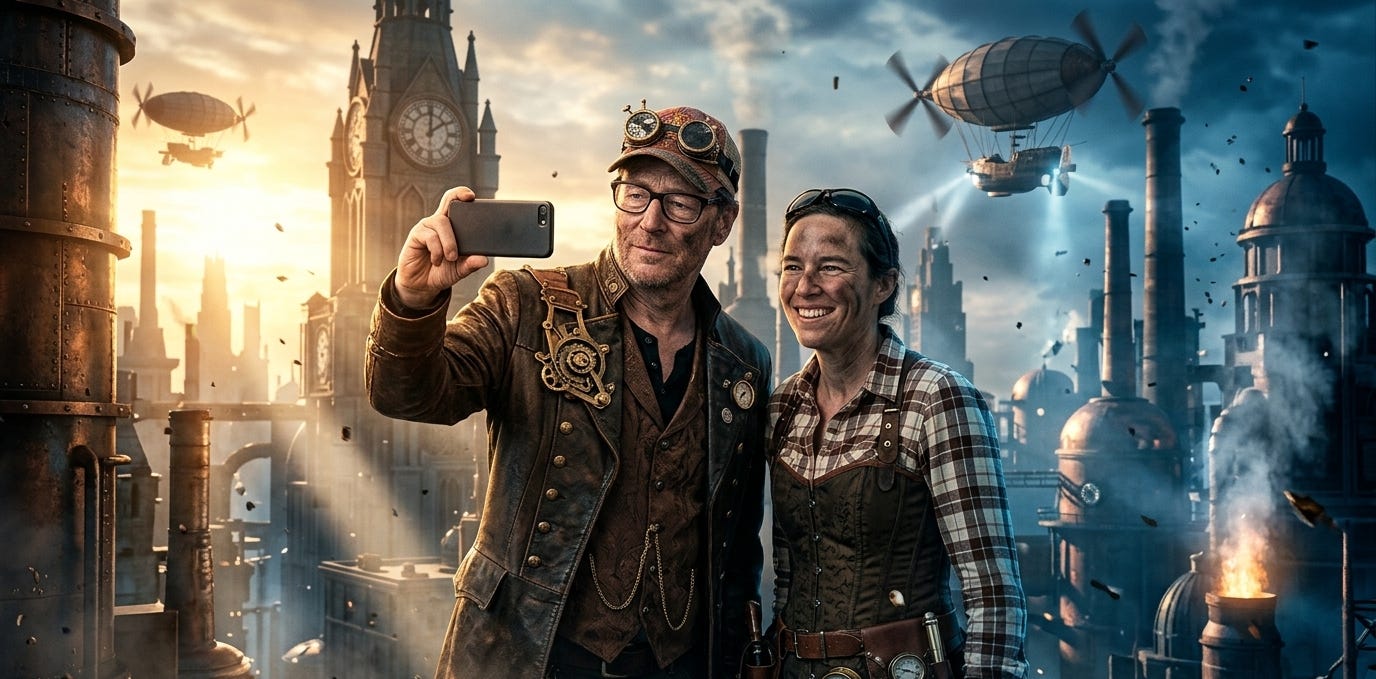 The first jump landed them somewhere that smelled like copper and smoke, cobblestones under their wheels, airships overhead. Bill was wearing a leather duster and goggles before he even understood what had happened. Mo had a corset with actual gauges on it. They took a selfie on a brass communication device because of course they did.
