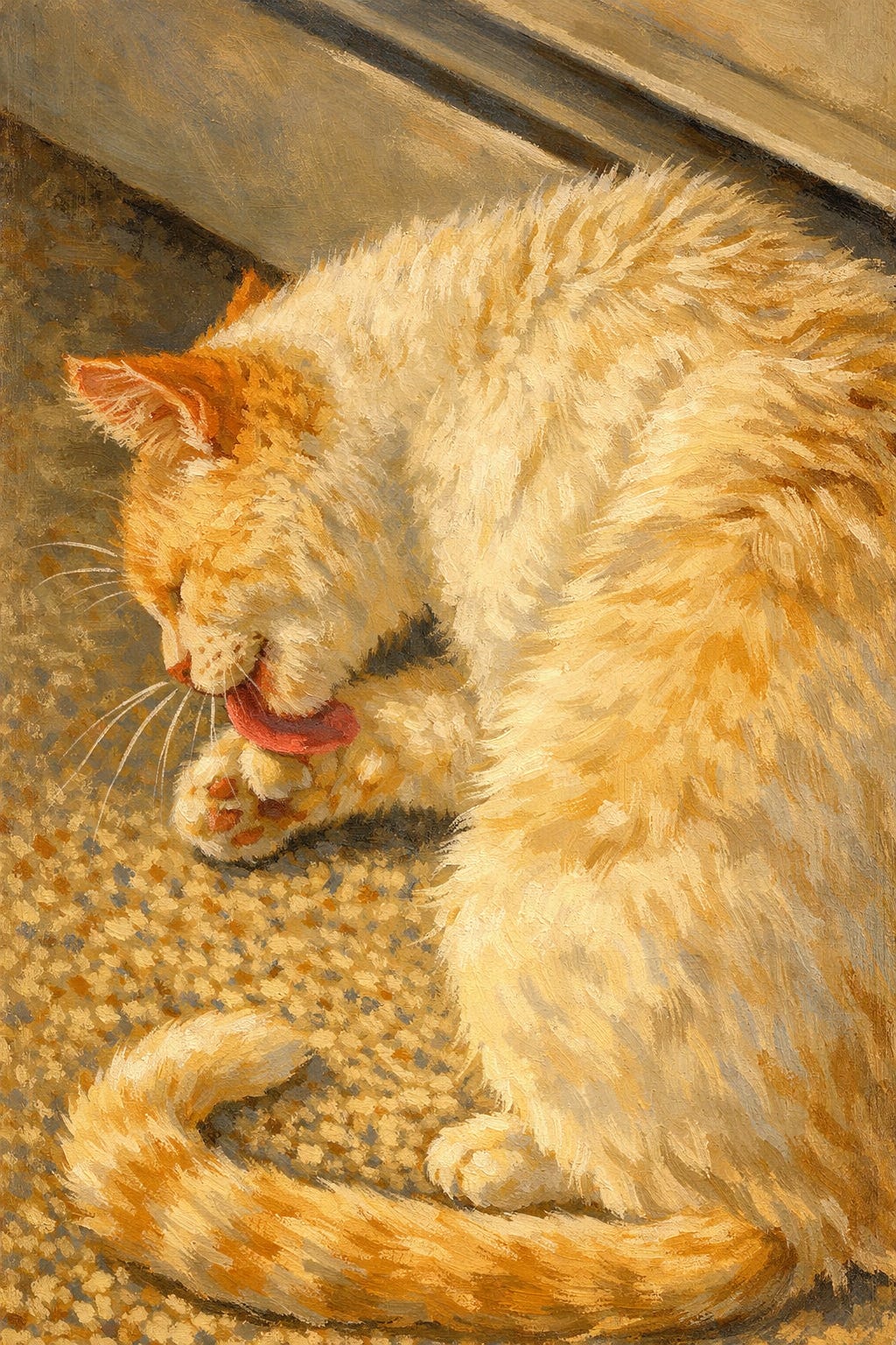 Blue is the neighbor's cat. Orange and white, fluffy, and completely unbothered by concepts like property boundaries or rental agreements. He jumped up on the couch, circled twice, and settled in like he owned the place. Like he'd been paying rent here for years.