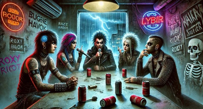 A dimly lit backstage lounge, maybe an industrial-looking interview room, the kind with flickering neon signs and a lingering haze of cigarette smoke. Around a battered table, four distinct forces in the rock and metal scene, Eugene X, Raze Havok, Raven Steele, and Roxy Riot, sit like a rogue council of sound and fury. Each band radiates their own brand of attitude, from leather-clad anarchy to tattooed philosophical doom. The air crackles with a mix of exhaustion and electric anticipation.